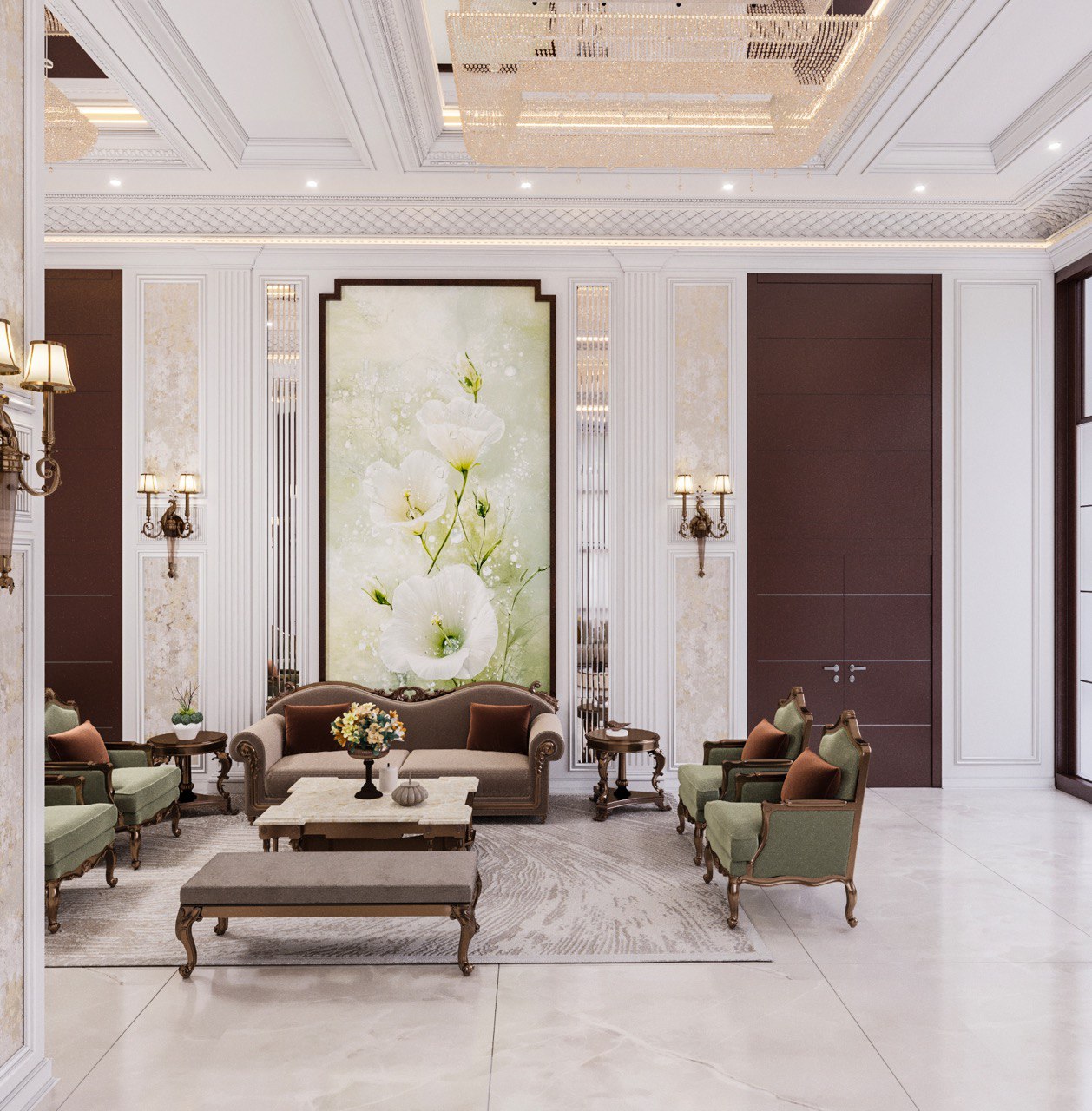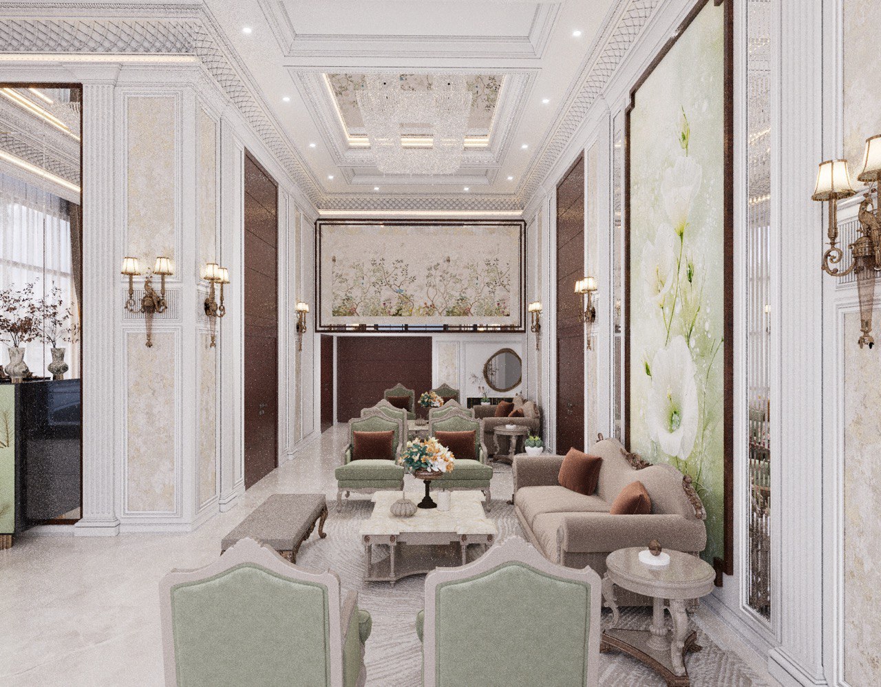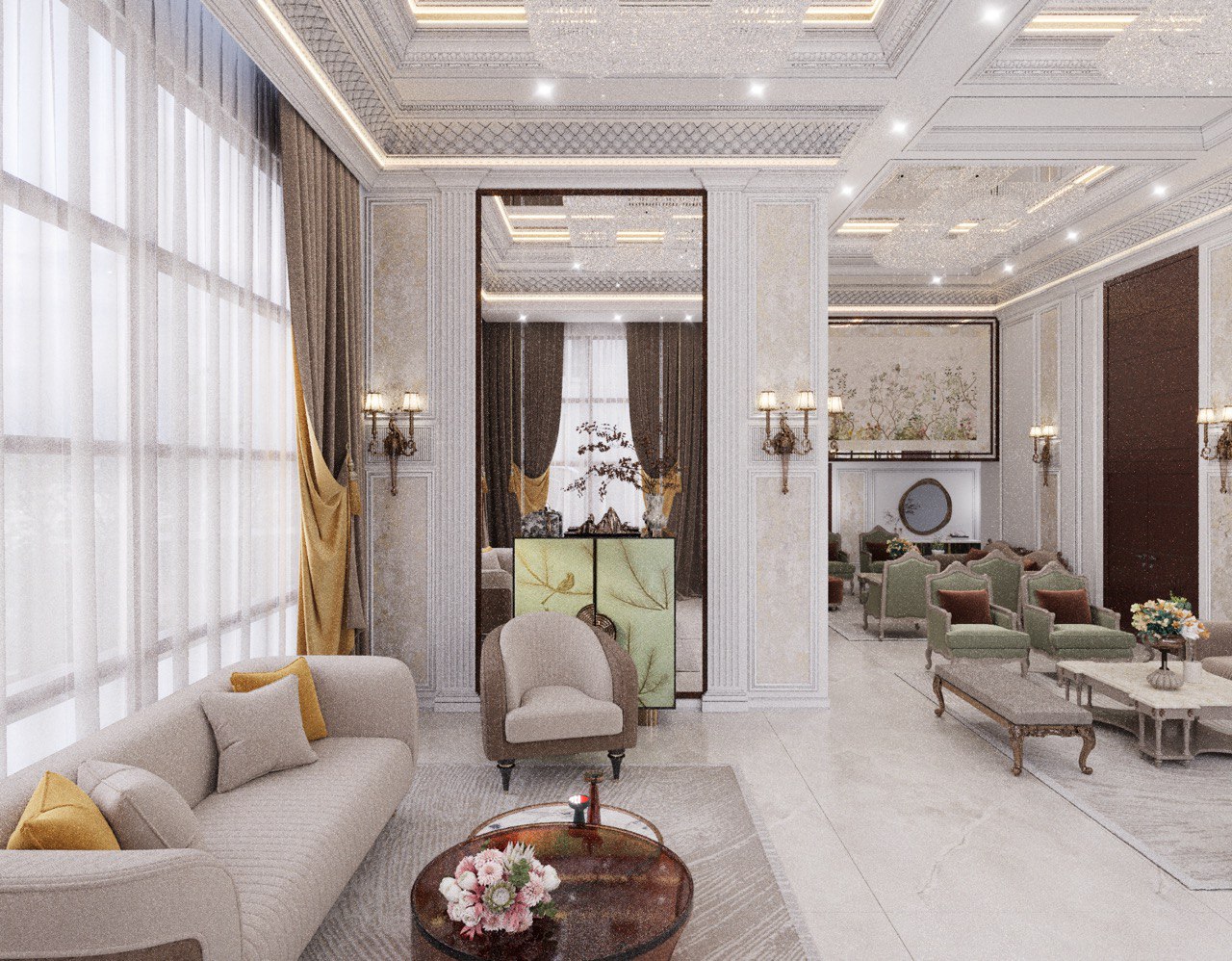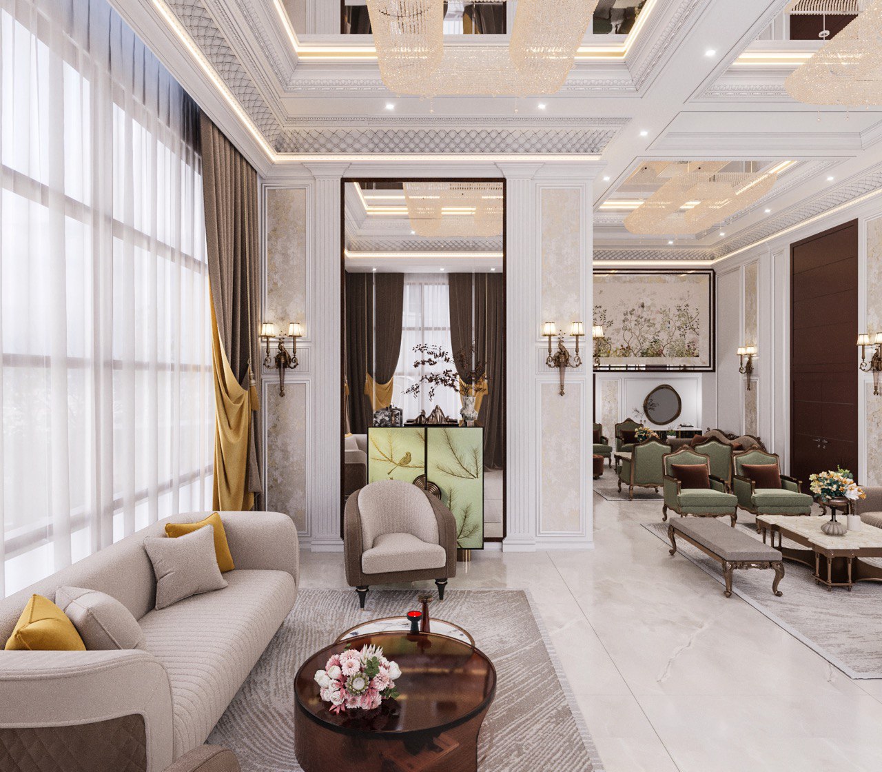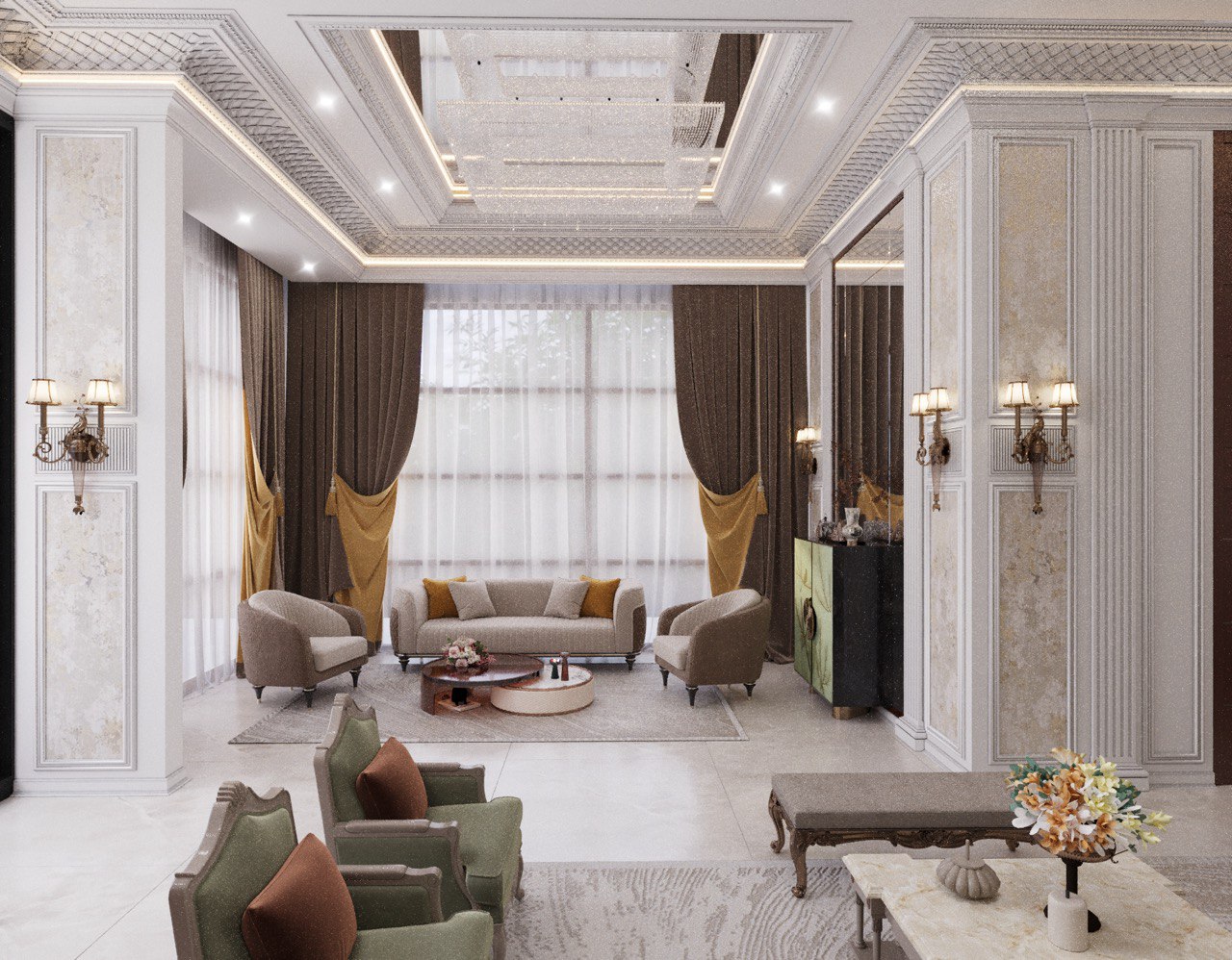 Grand Ceilings: Custom ceiling panels featuring classic detailing and mirror work not only highlight the impressive height but also create a luxurious, light-filled atmosphere.