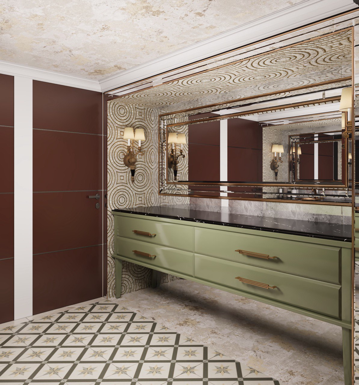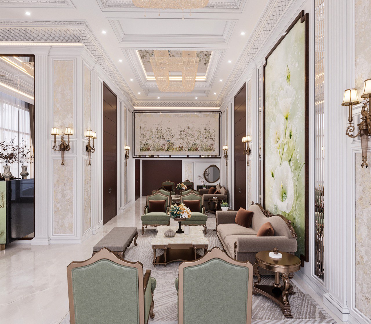 To balance the client’s existing dark brown doors, we introduced a refined color palette with soft shades of green. This not only softened the heavy tones but also added a layer of fresh elegance to the space. For the entrance wall, the outdated balusters were removed and replaced with a bespoke, hand-painted artwork, establishing a powerful and artistic focal point. We further embraced the classic style by designing detailed, handcrafted paneling for the walls. Finally, the wall between the majlis and corridor was removed, resulting in a magnificent, open-plan area furnished with curated classic pieces that perfectly complemented the overall concept.