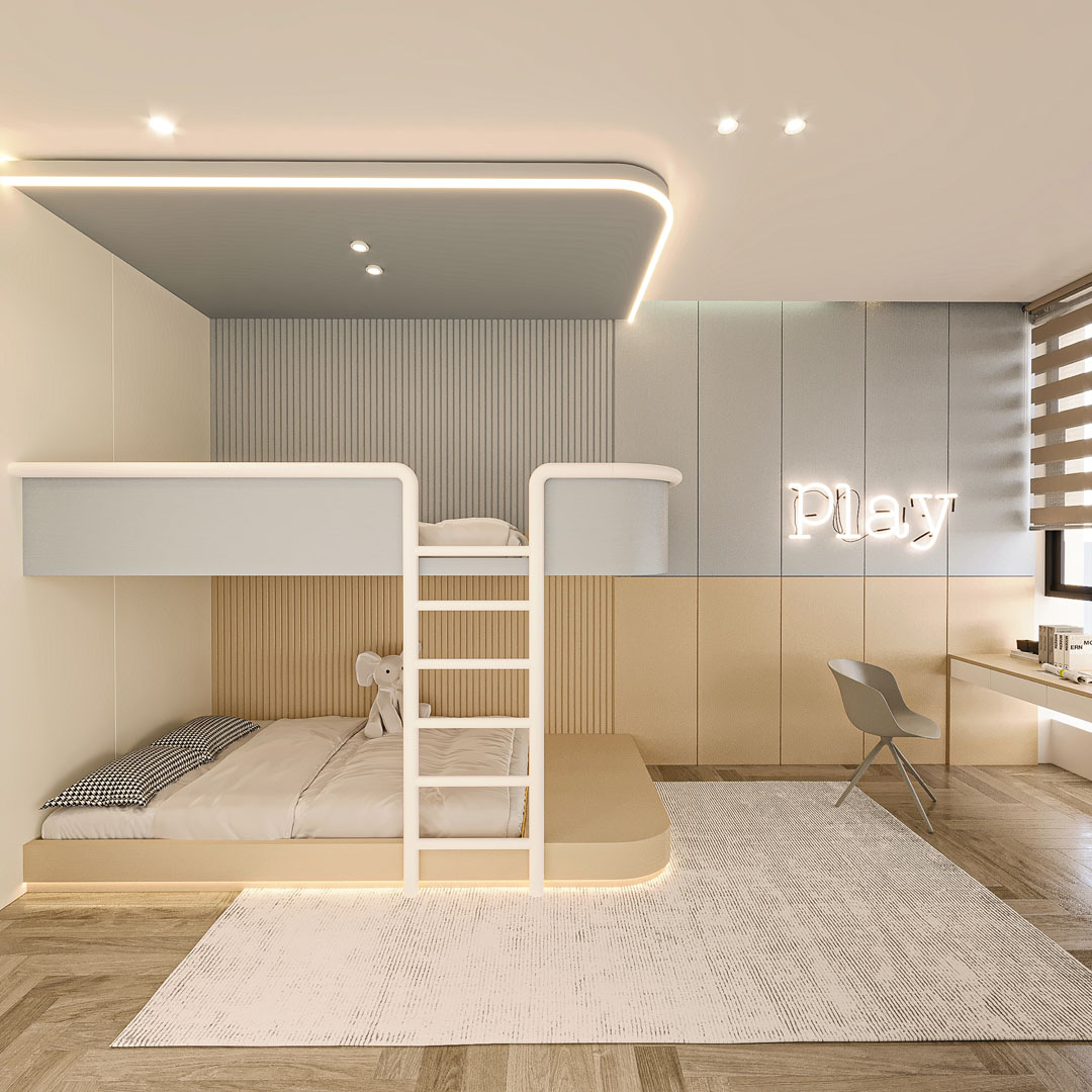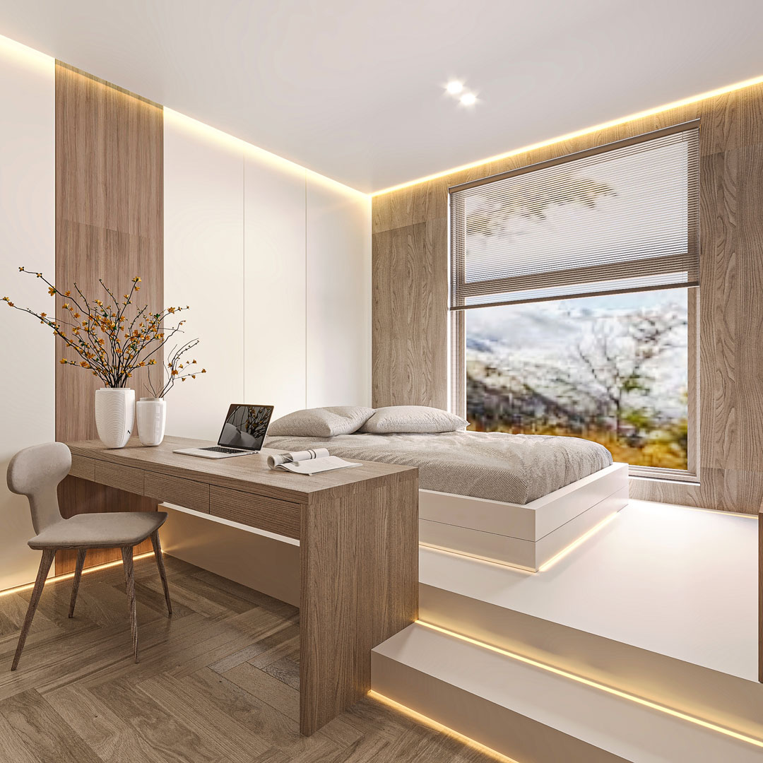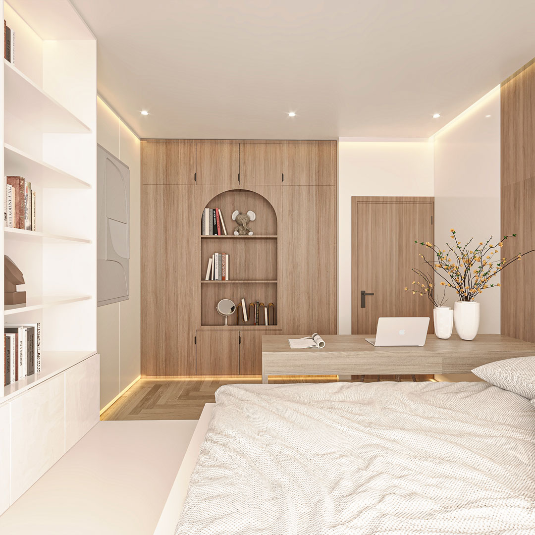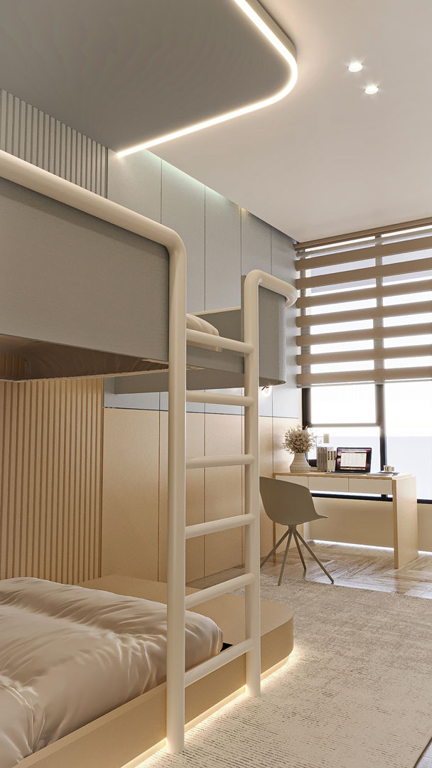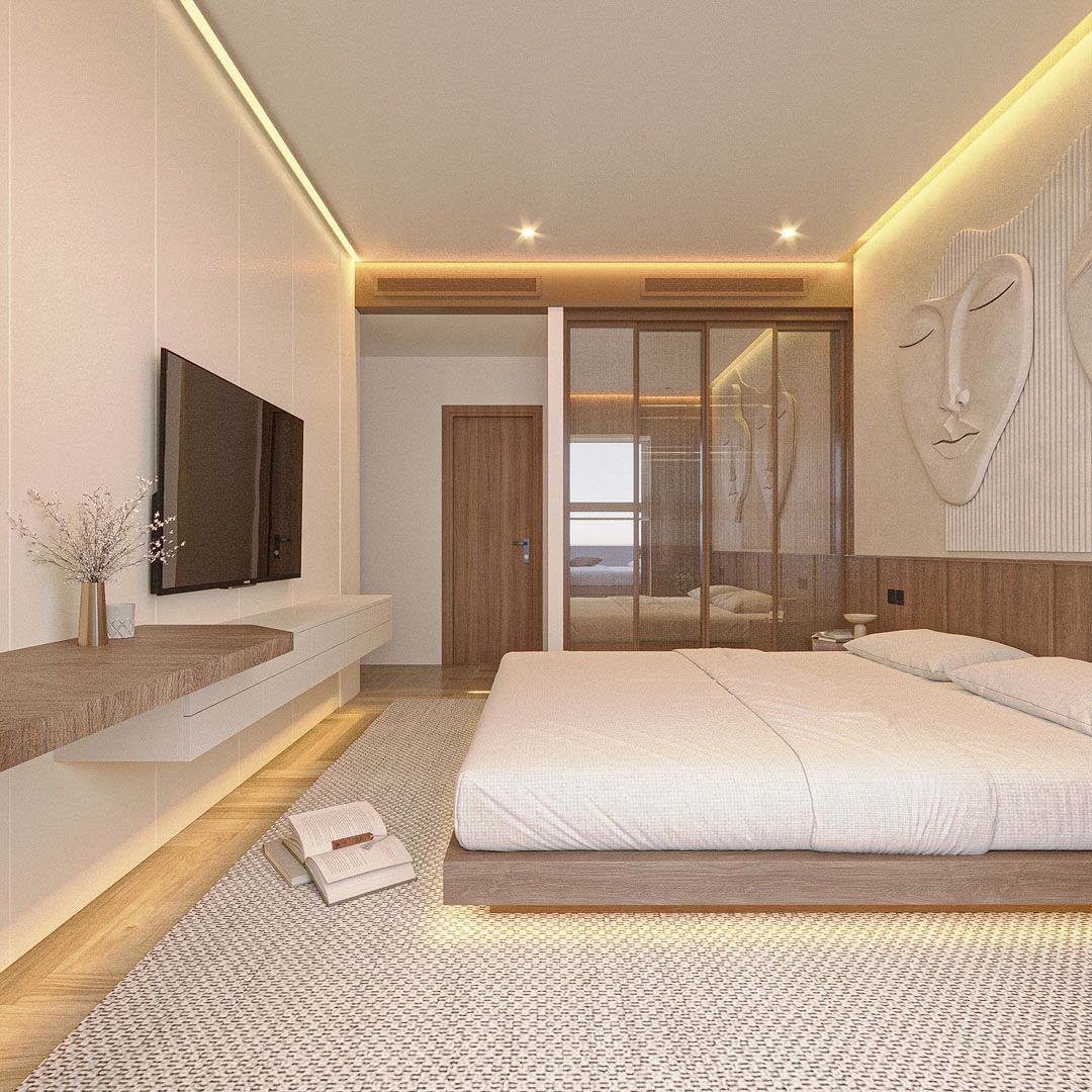 Our approach centered on a palette of light, natural wood tones, soft neutrals (beige, cream, light grey), and abundant textures. We focused on clean lines and uncluttered spaces, designing custom joinery for seamless storage and visual harmony. Integrated LED strip lighting was used extensively to create a warm, indirect glow that enhances the calming atmosphere, especially noticeable in features like the platform beds and shelving units.