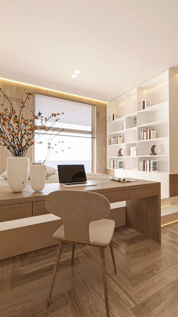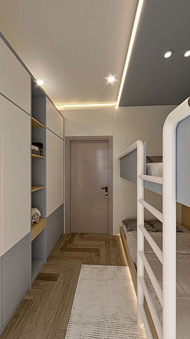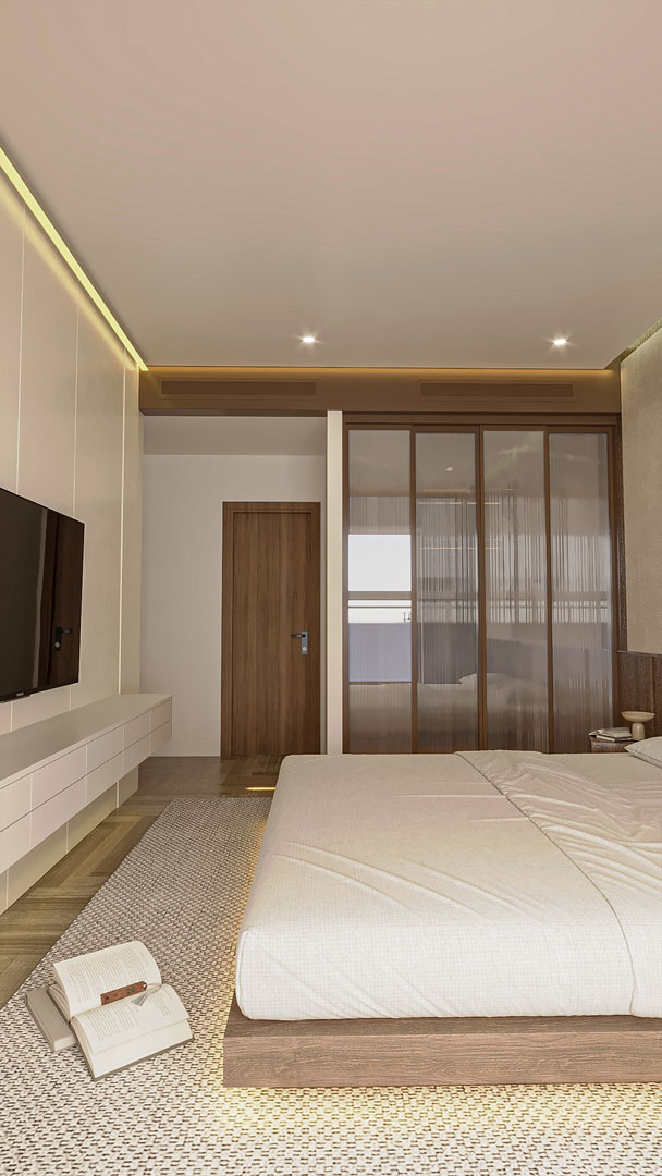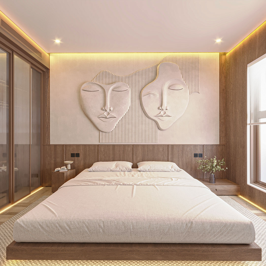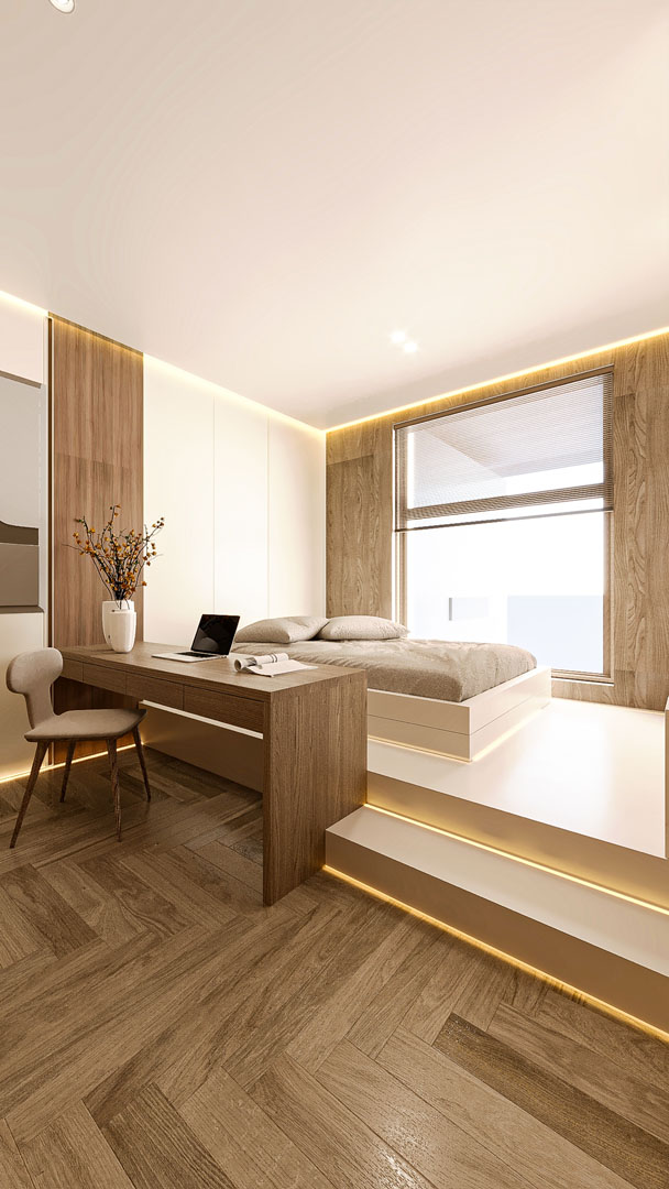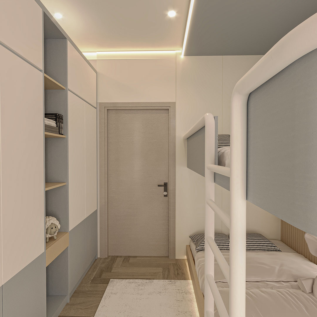 Our approach centered on a palette of light, natural wood tones, soft neutrals (beige, cream, light grey), and abundant textures. We focused on clean lines and uncluttered spaces, designing custom joinery for seamless storage and visual harmony. Integrated LED strip lighting was used extensively to create a warm, indirect glow that enhances the calming atmosphere, especially noticeable in features like the platform beds and shelving units.
