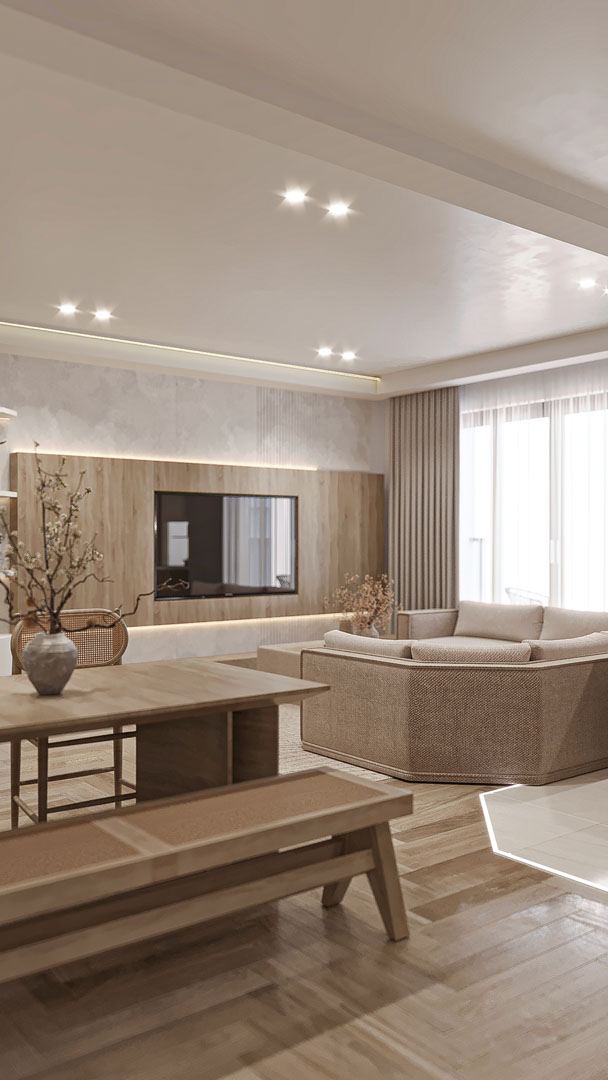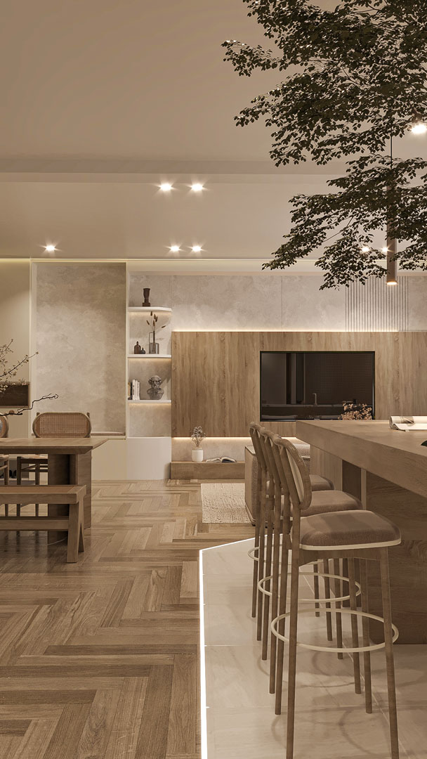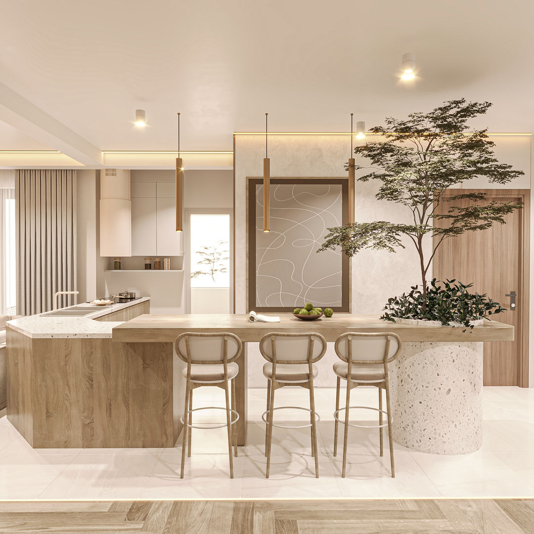 A key element of the Japandi style is the connection to nature, which we introduced through wood paneling, stone accents (like the unique bathroom sink), terrazzo flooring, and even a statement indoor tree integrated into the kitchen island. Each space, from the open-plan living area to the minimalist bedrooms and spa-like bathrooms, was designed to flow cohesively, promoting a sense of peace and simplicity.