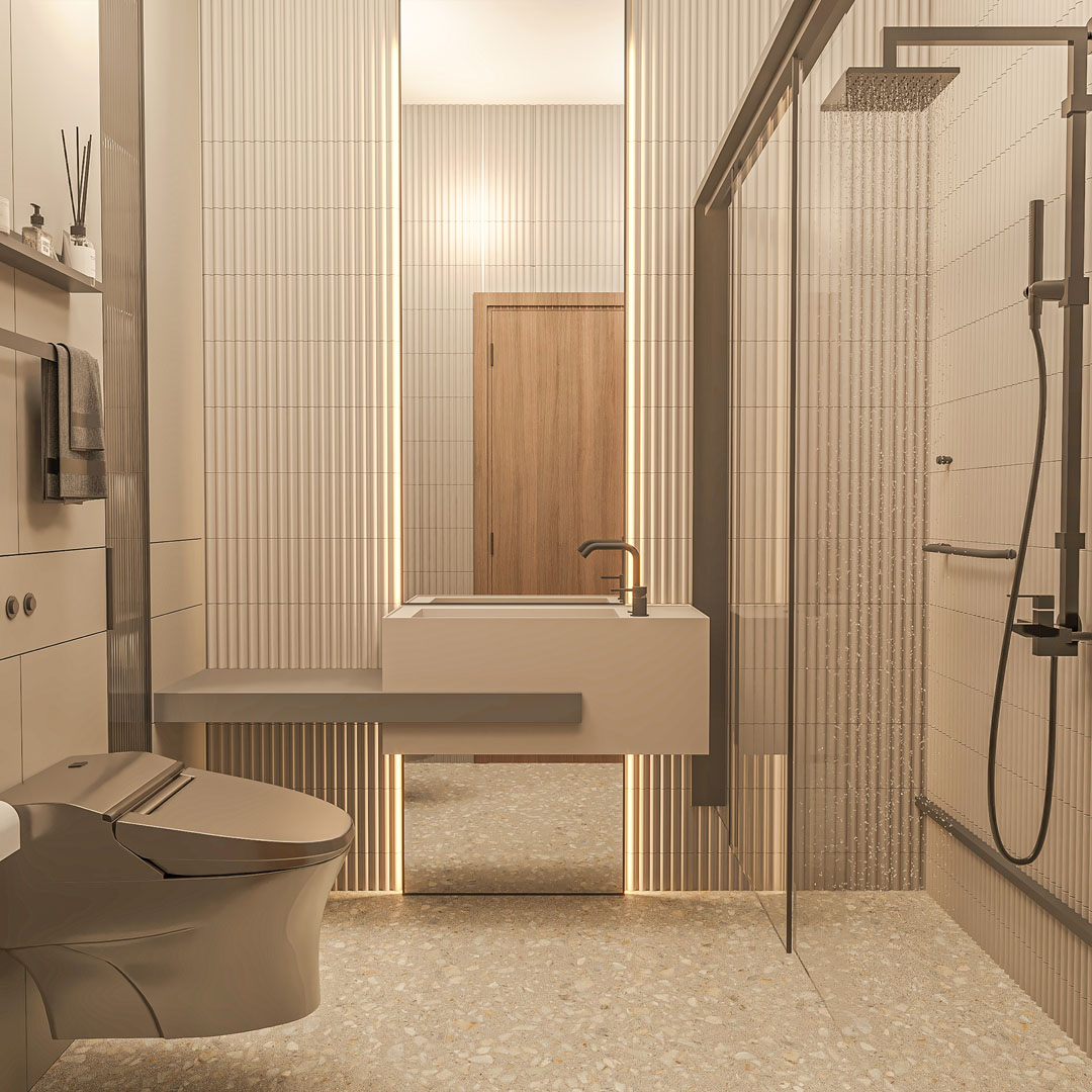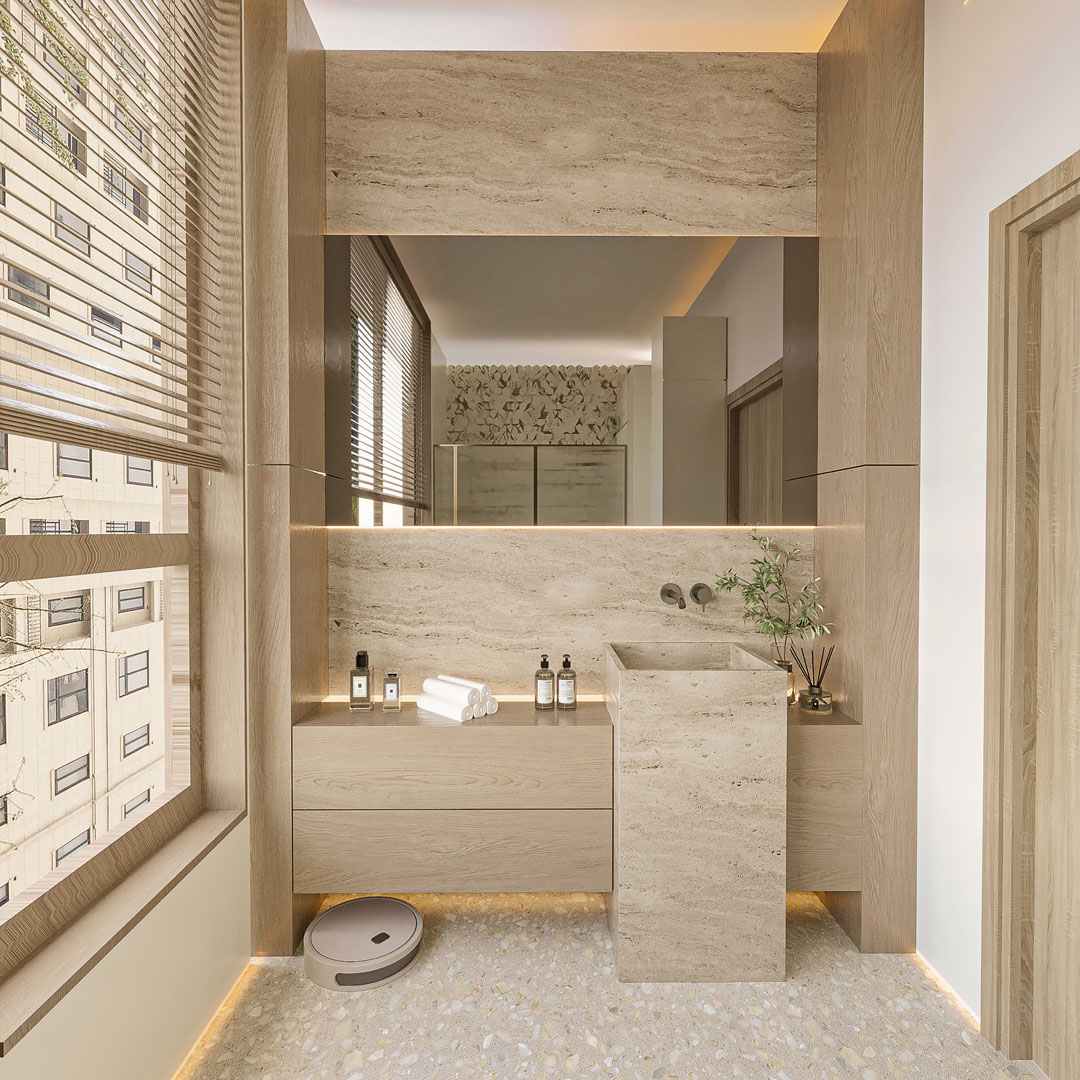 Serene Bedrooms & Bathrooms: Bedrooms feature platform beds and minimalist décor, while bathrooms evoke a spa-like feel with natural stone sinks, terrazzo floors, and ribbed textures.