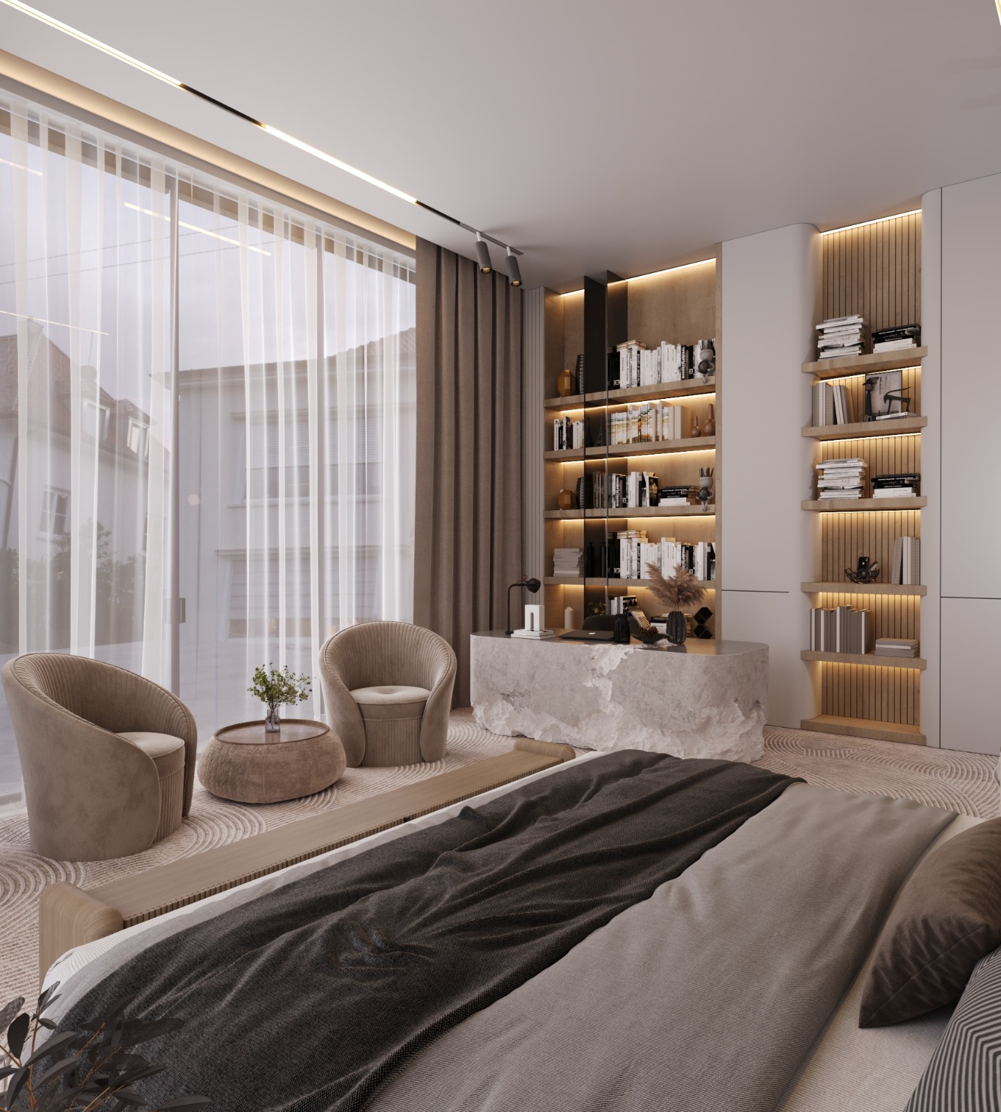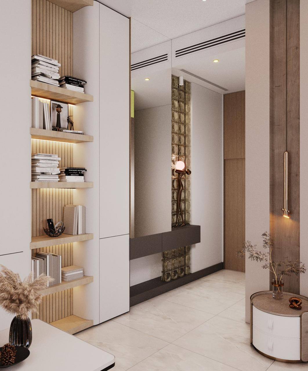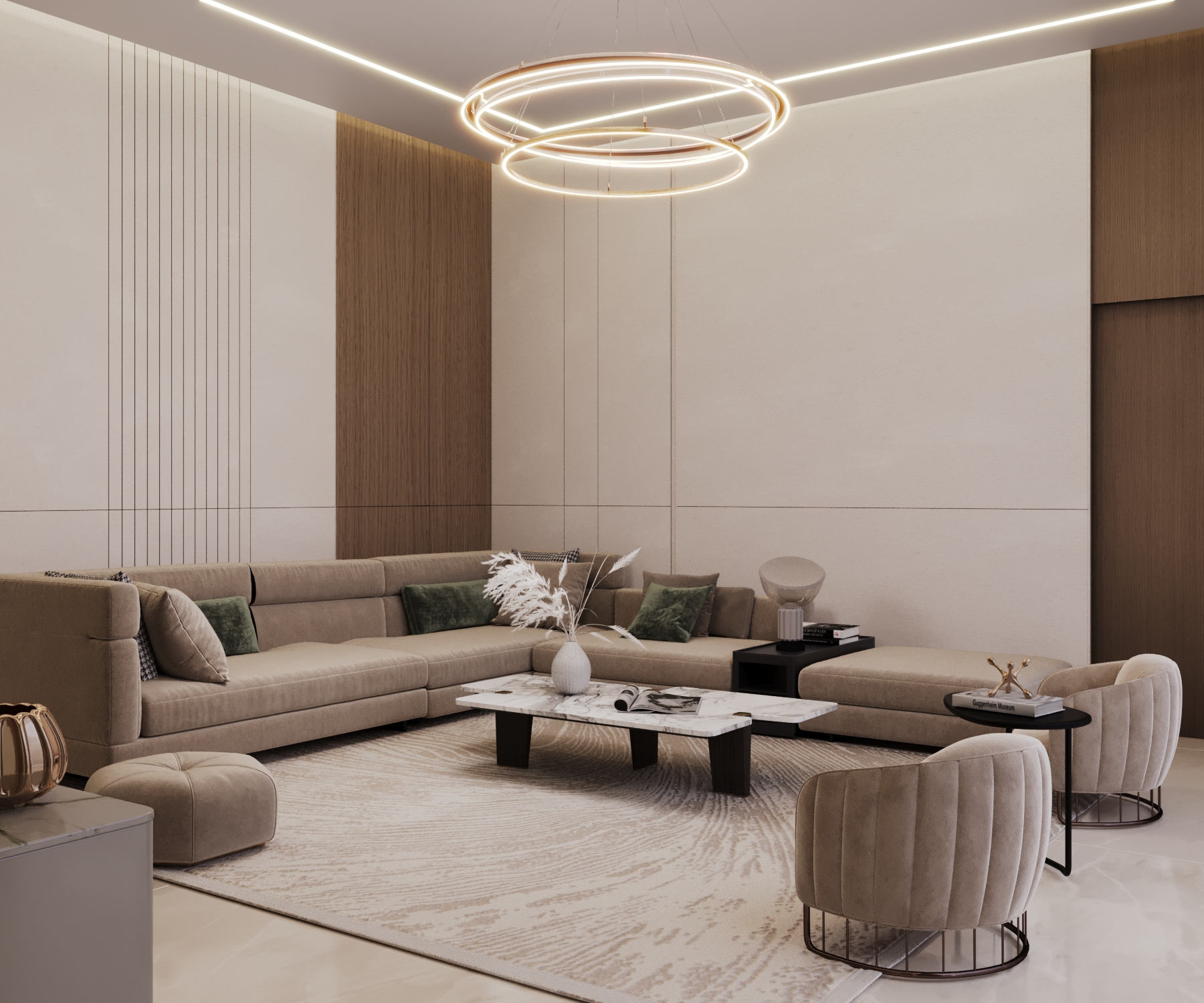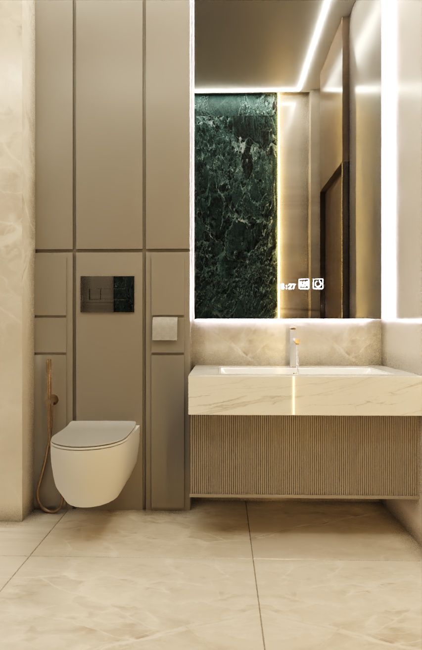 The second floor was crafted as the ultimate Private Entertainment & Guest Quarters. It features a stunning, panoramic majlis complete with a cozy fireplace and a sleek kitchenette, providing an exclusive setting for intimate gatherings. This floor also includes additional private bedrooms, offering secluded and comfortable accommodation for guests. A consistent palette of luxurious materials, including rich woods, elegant marble, and bespoke lighting, ensures a harmonious flow throughout all private areas.