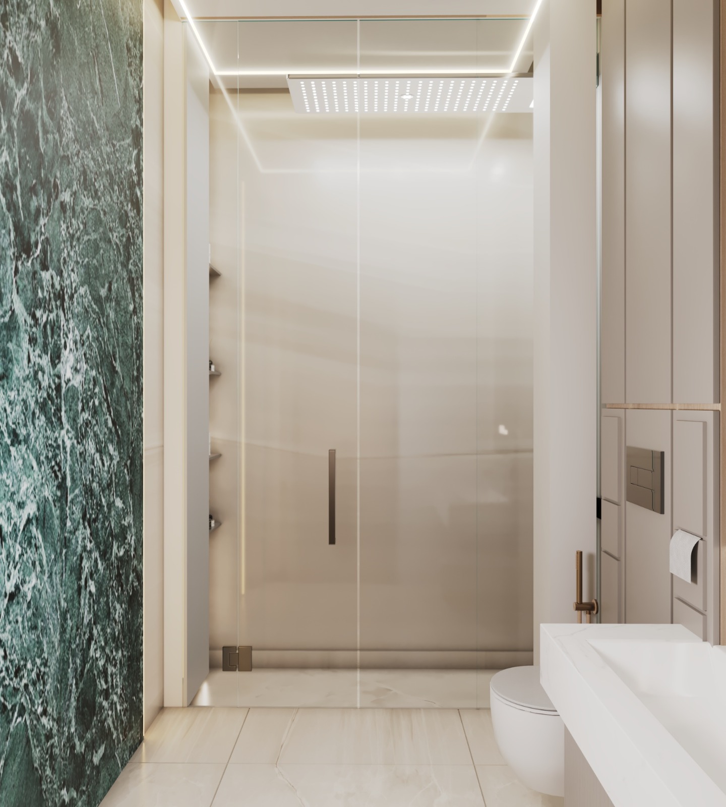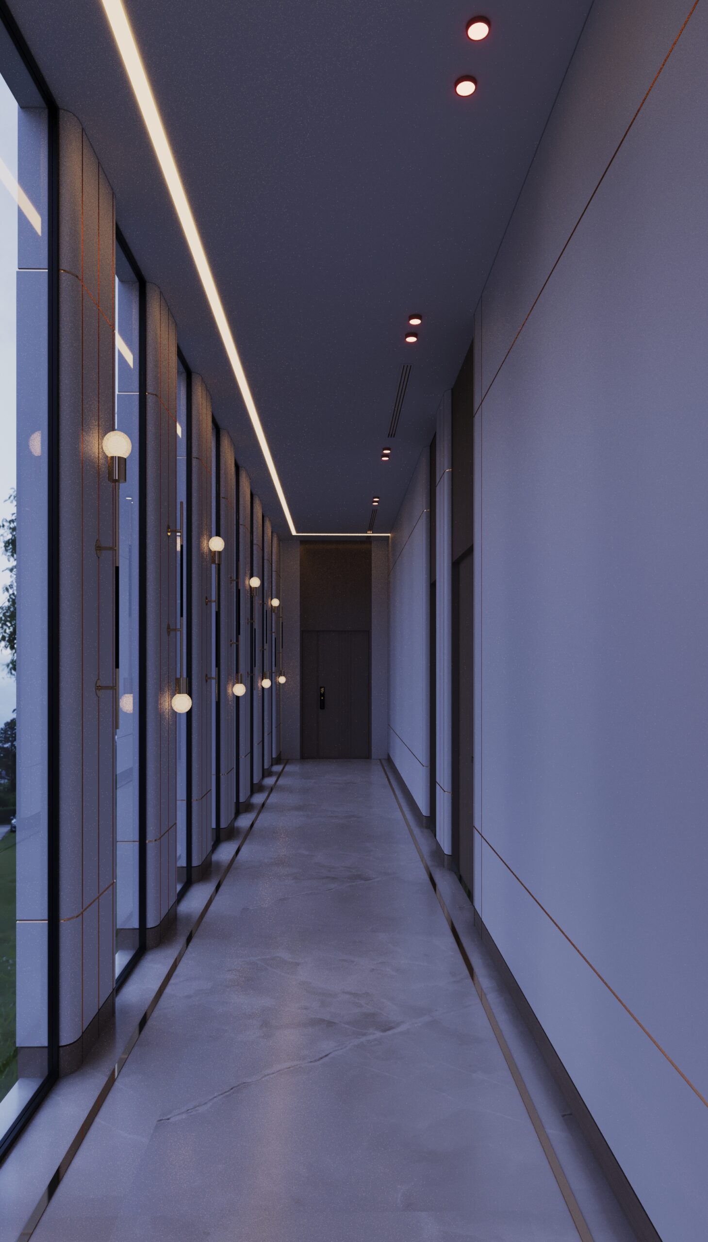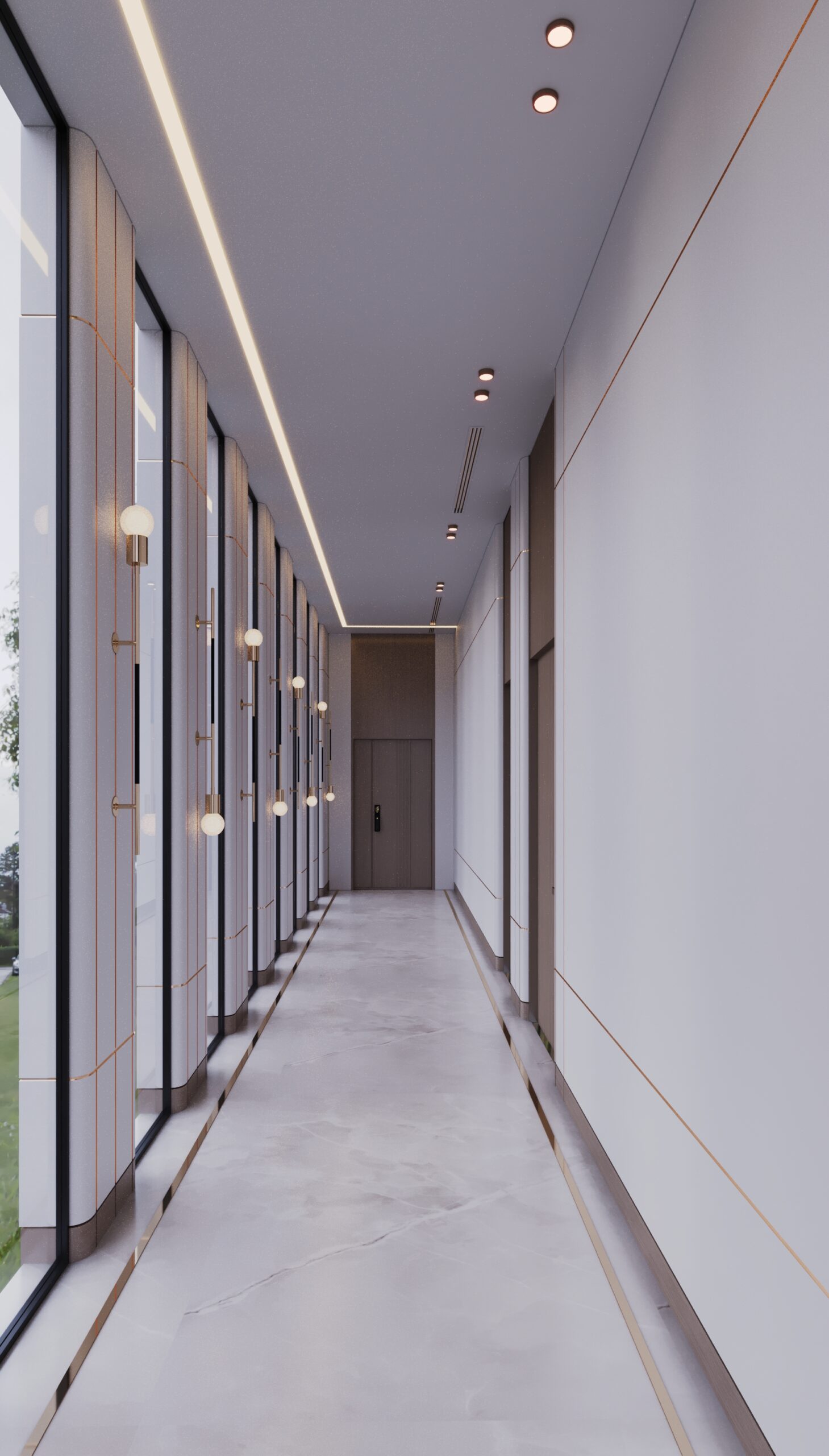 The second floor was crafted as the ultimate Private Entertainment & Guest Quarters. It features a stunning, panoramic majlis complete with a cozy fireplace and a sleek kitchenette, providing an exclusive setting for intimate gatherings. This floor also includes additional private bedrooms, offering secluded and comfortable accommodation for guests. A consistent palette of luxurious materials, including rich woods, elegant marble, and bespoke lighting, ensures a harmonious flow throughout all private areas.