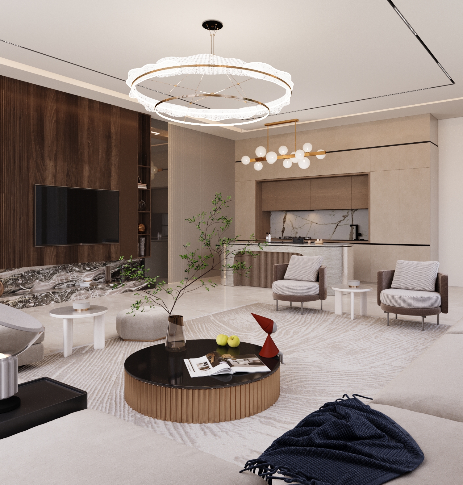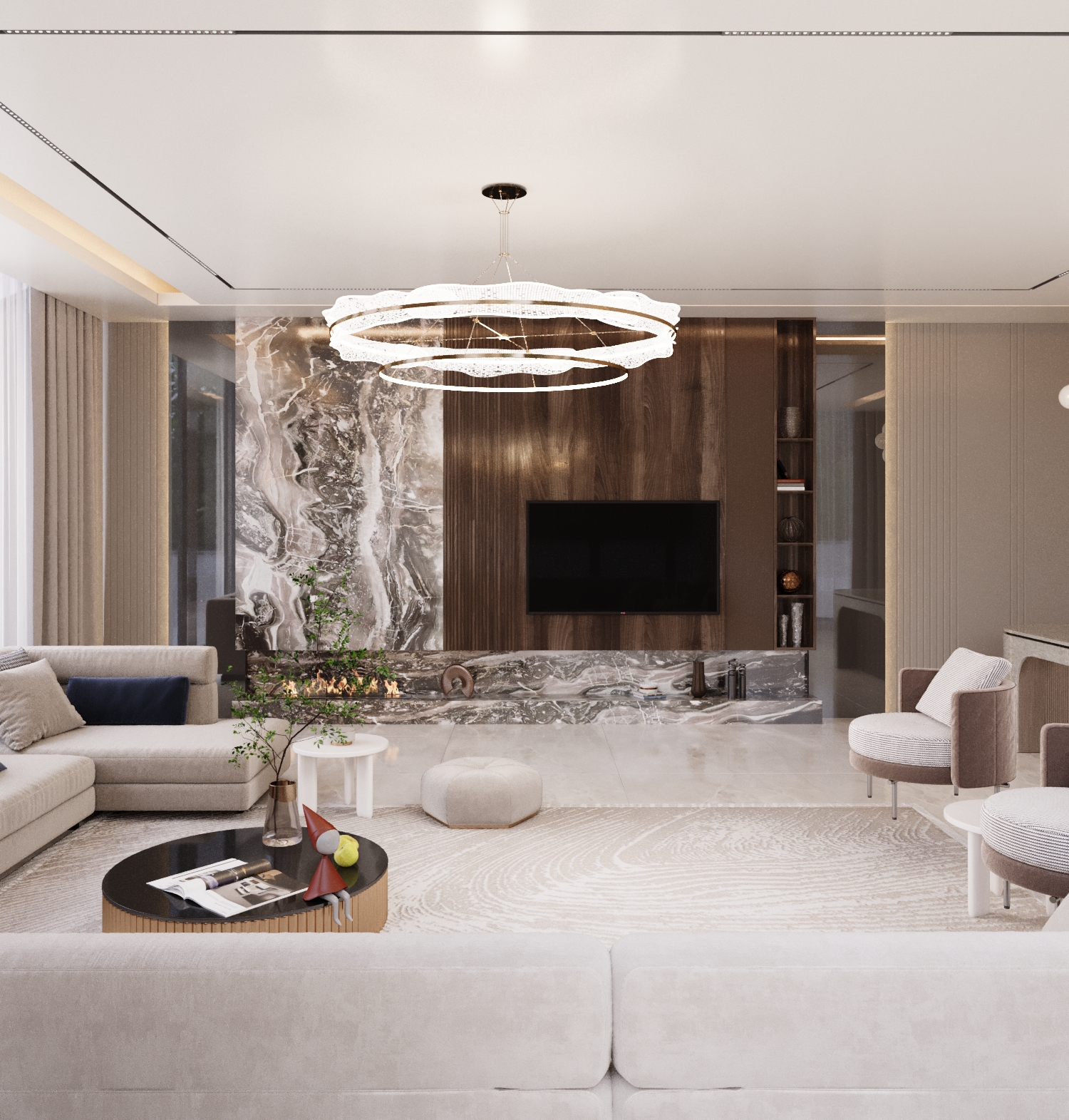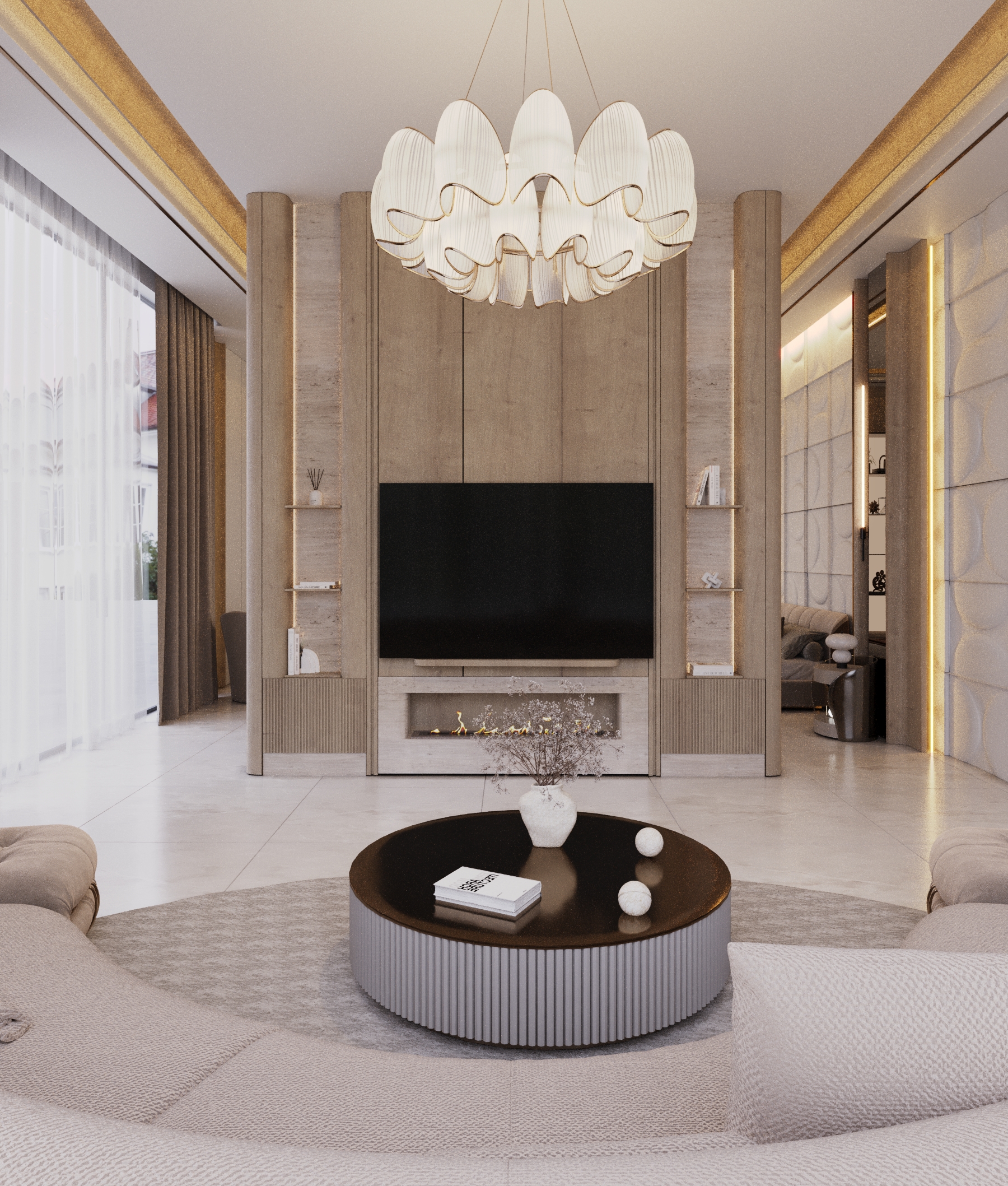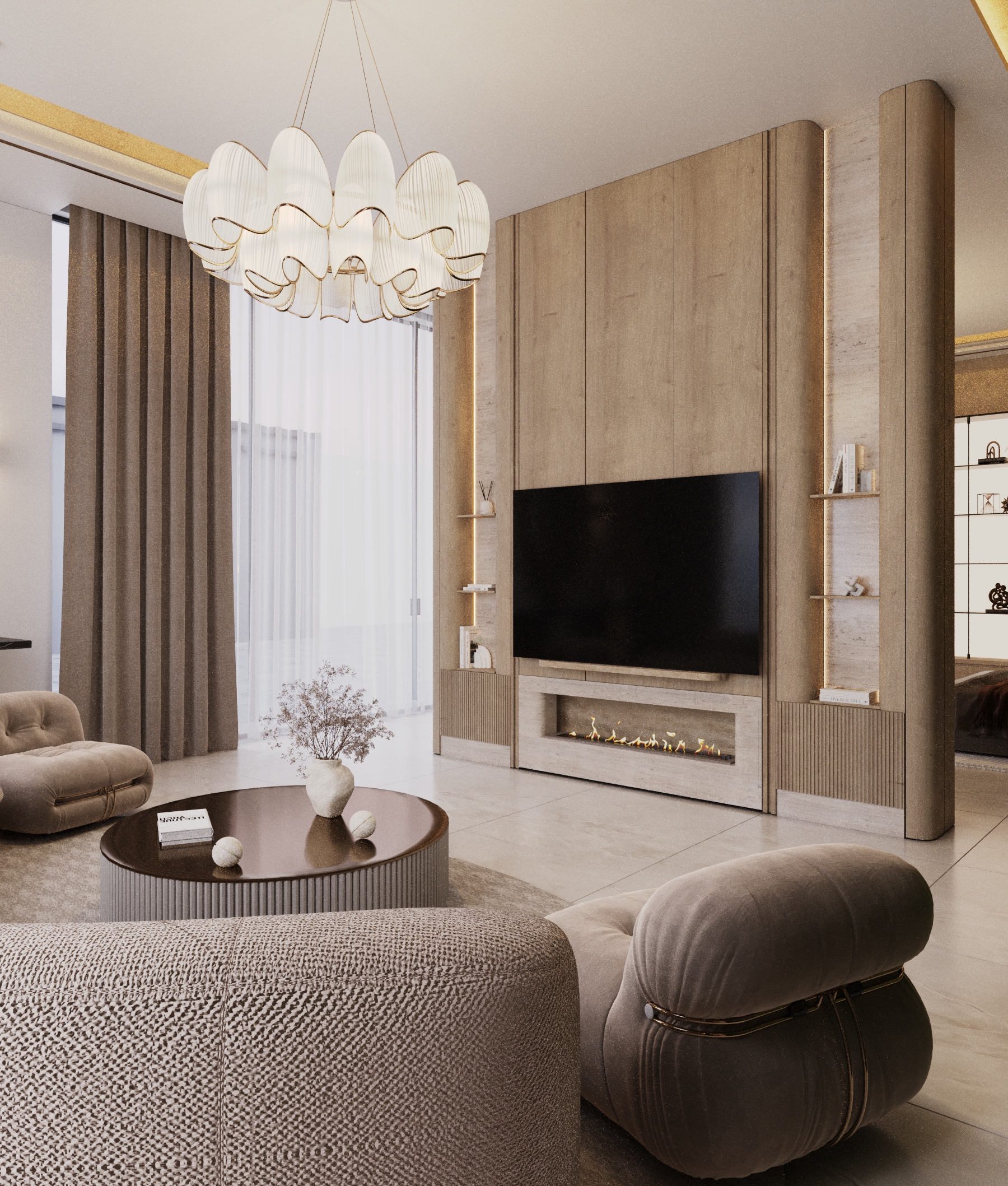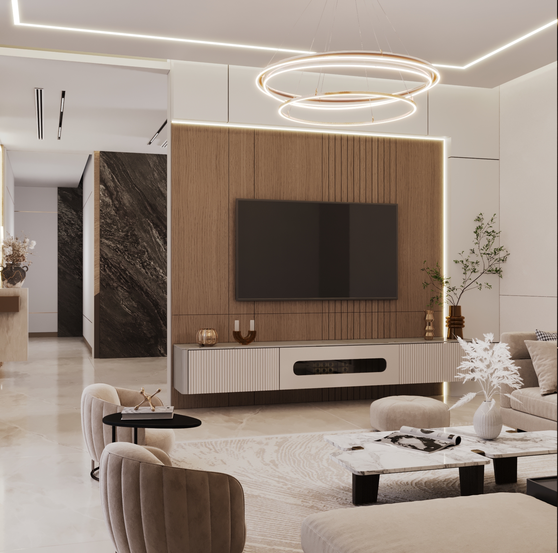 First-Floor Family Lounge: A spacious and modern living room acts as the central hub for the family, designed for comfort, relaxation, and connection.