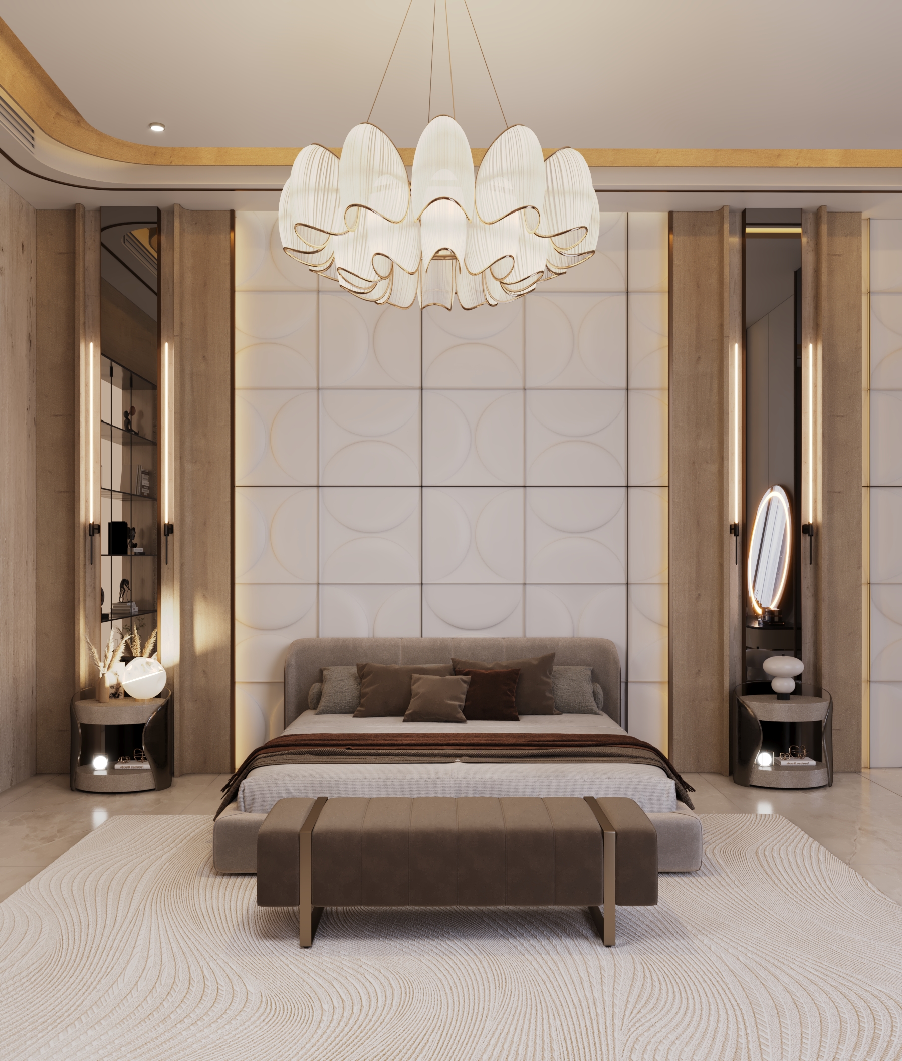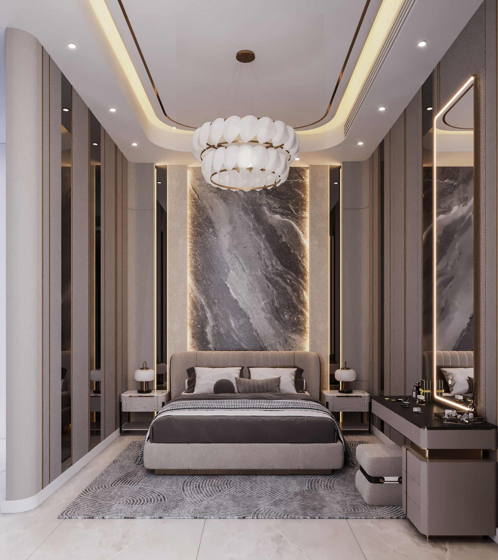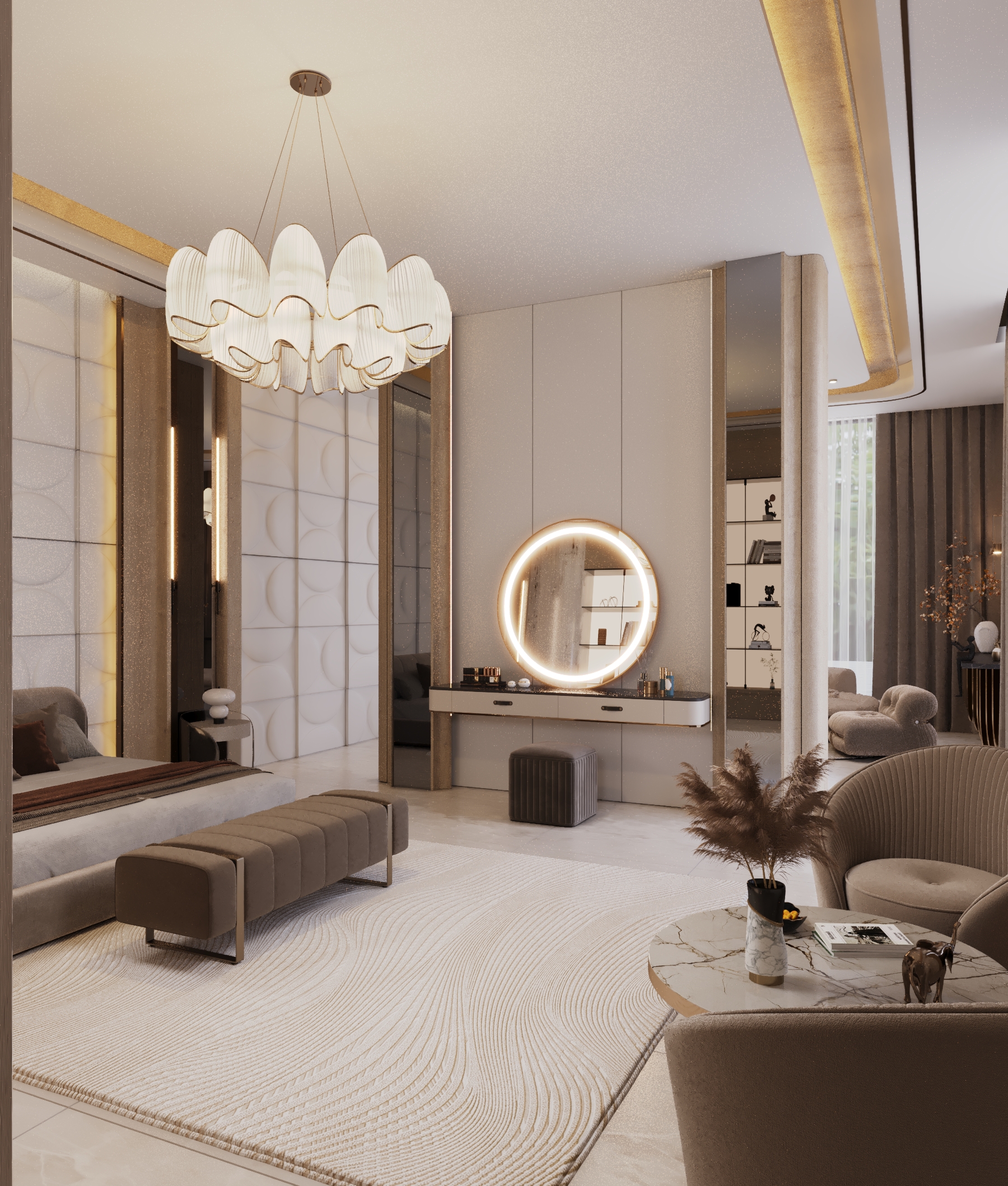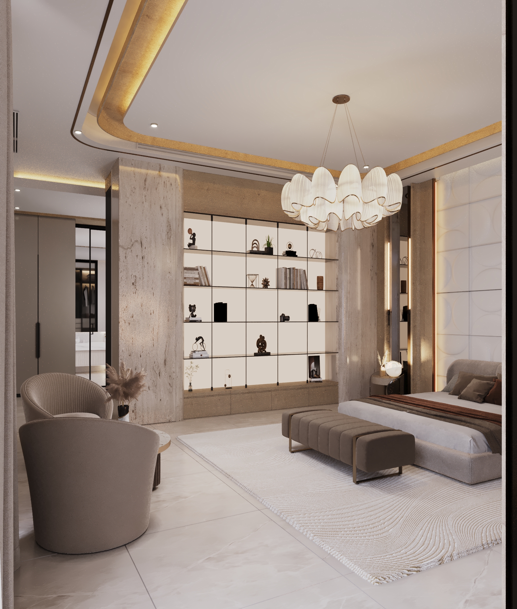 The upper floors of this villa were conceived as a private sanctuary, a world away from the formal entertaining spaces below. The primary challenge was to design a multi-level living experience that masterfully balanced shared family areas with highly personalized private suites. Our goal was to create a collection of unique bedrooms and lounges, each reflecting a distinct personality, yet all connected by a cohesive thread of modern luxury and unparalleled comfort.