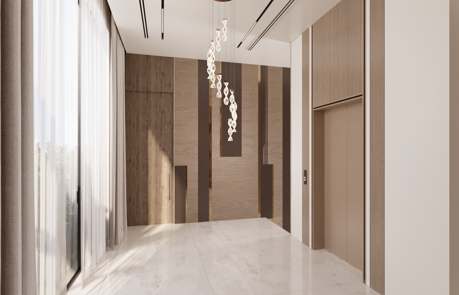 Luxurious Materials & Finishes: A consistent use of high-end materials such as natural stone, custom wood paneling, bespoke furniture, and statement lighting fixtures ties all the unique spaces together in a cohesive design language.