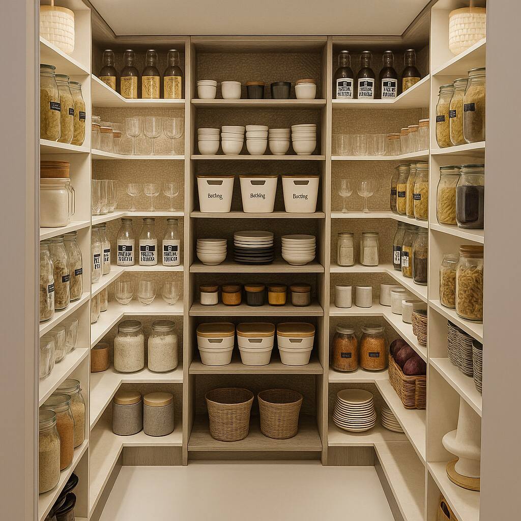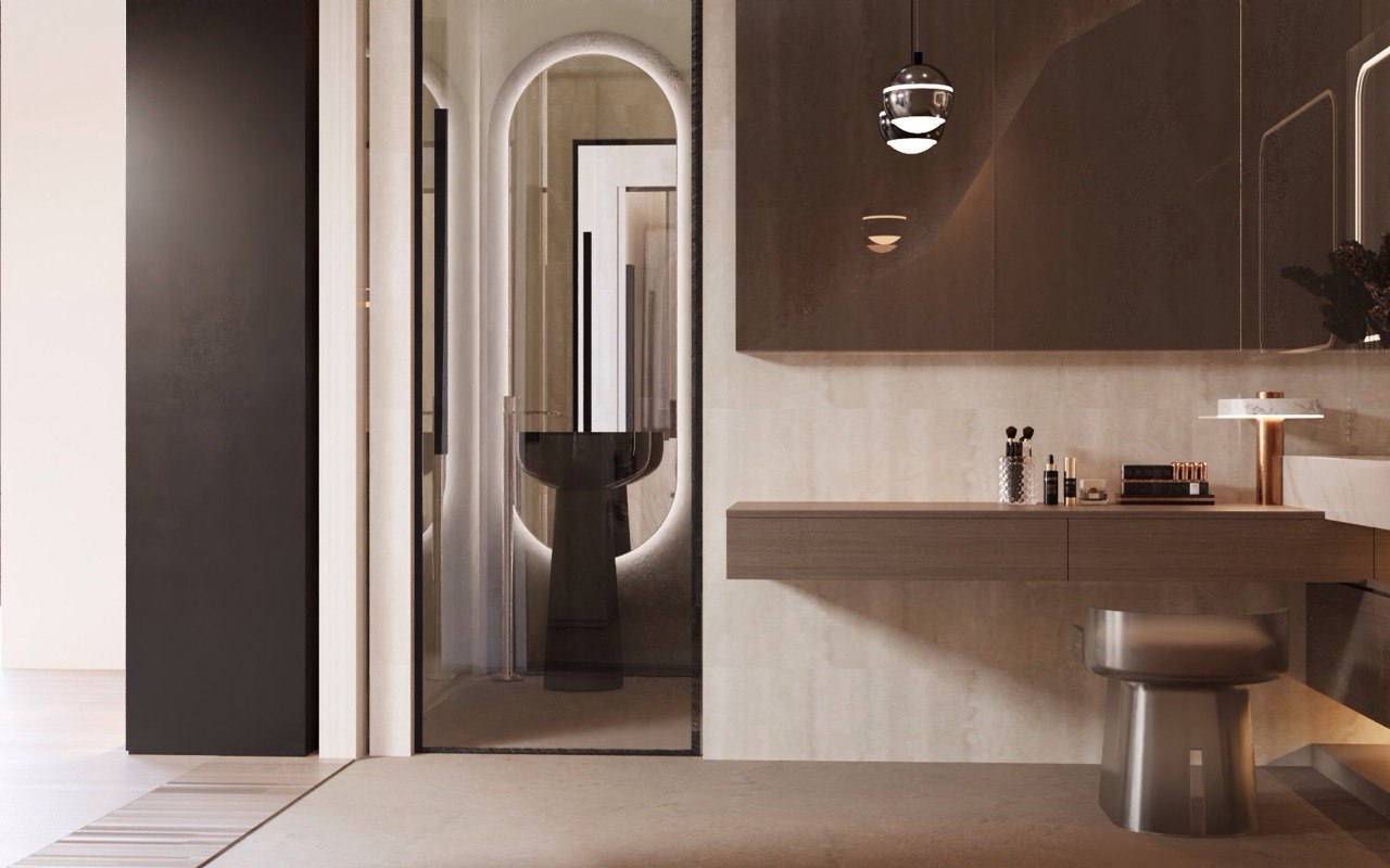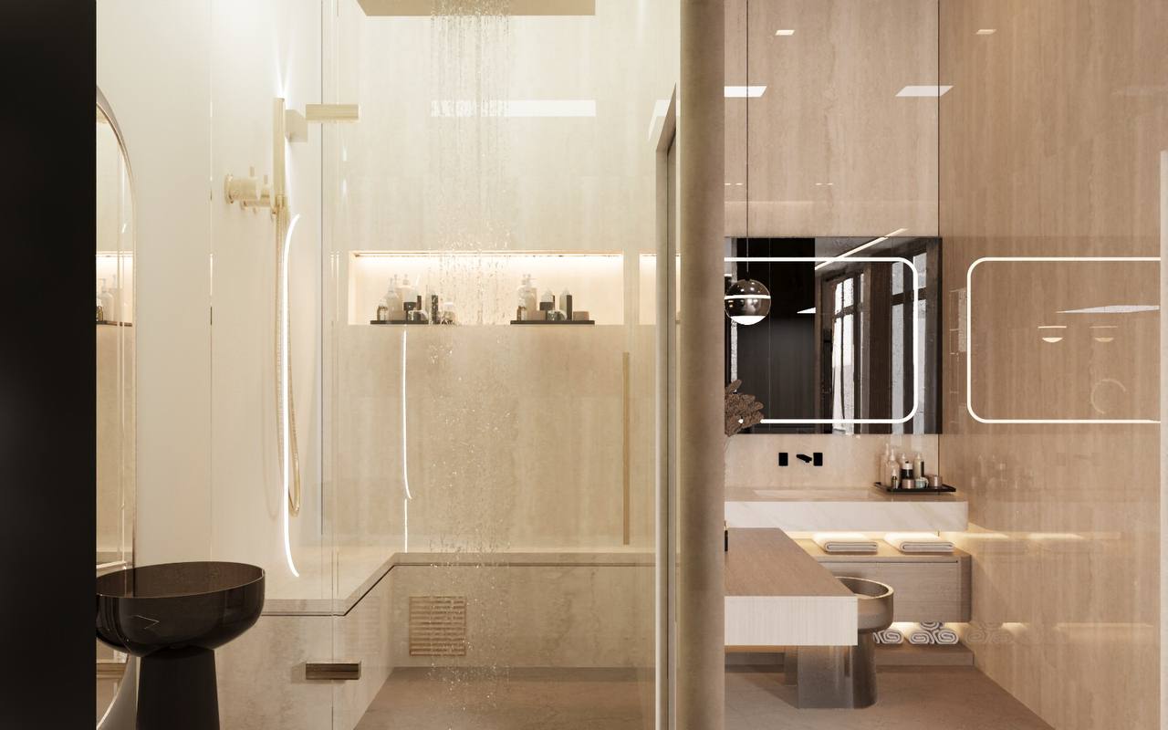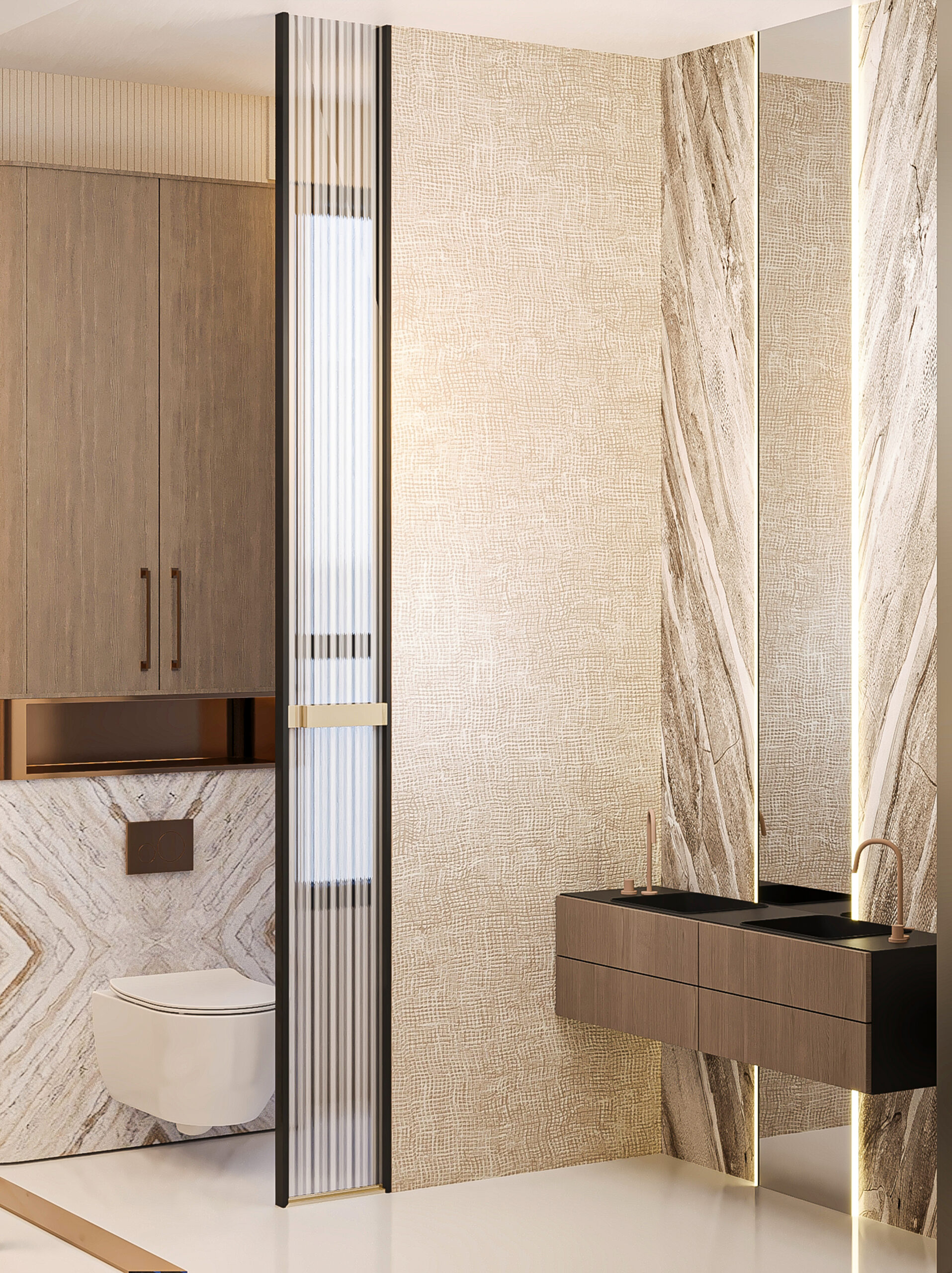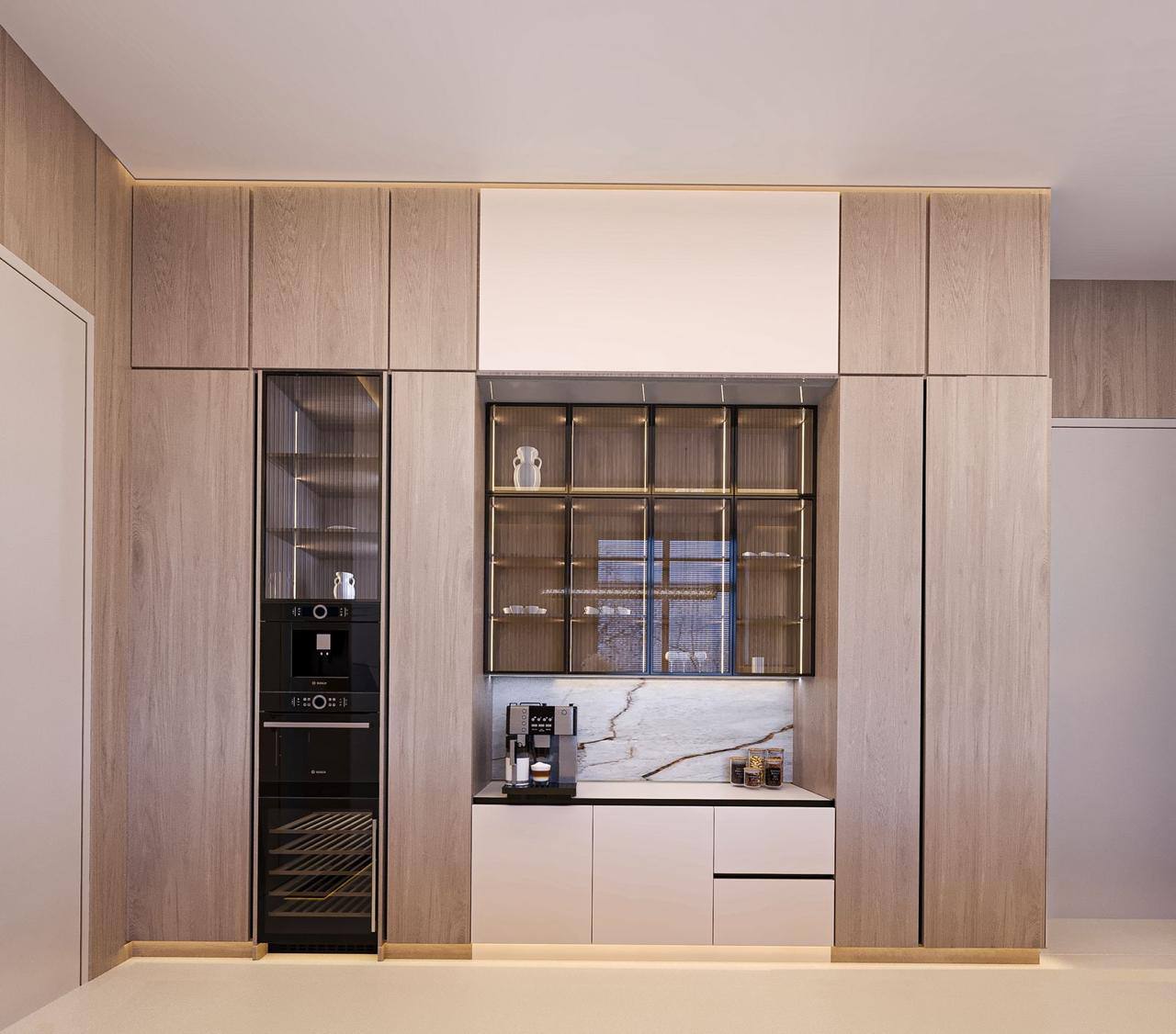 The ground floor also houses a stunning private master suite, conceived as a serene retreat that integrates living and sleeping areas with a spa-like en-suite bathroom. To meet the home’s culinary needs, we designed two distinct kitchens: a sleek, modern main kitchen for daily use and entertaining, and a fully-equipped professional “labor” kitchen for heavy-duty preparation