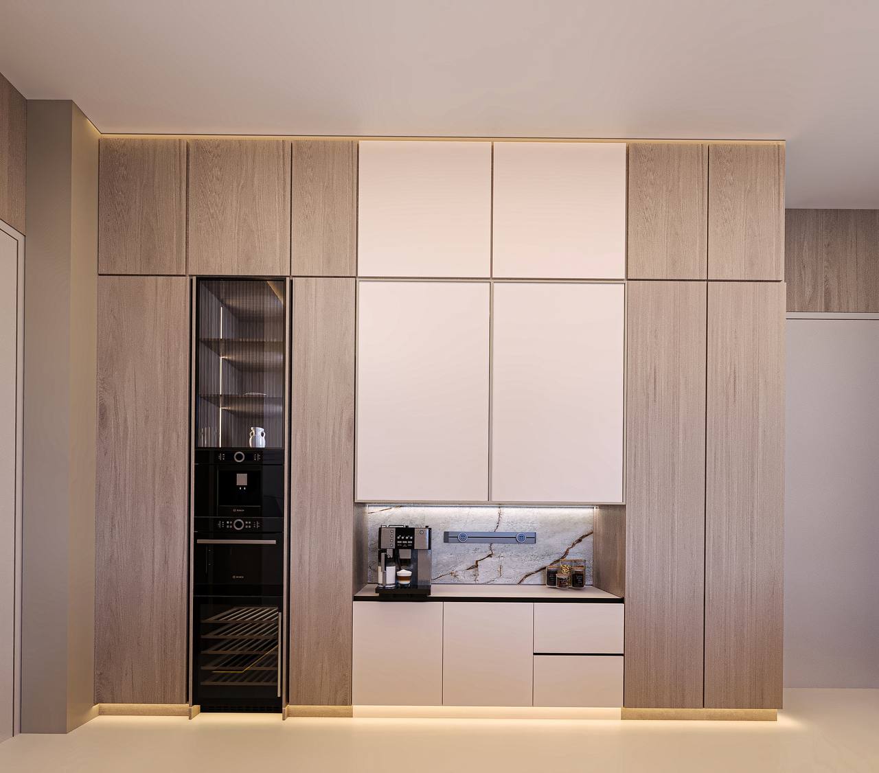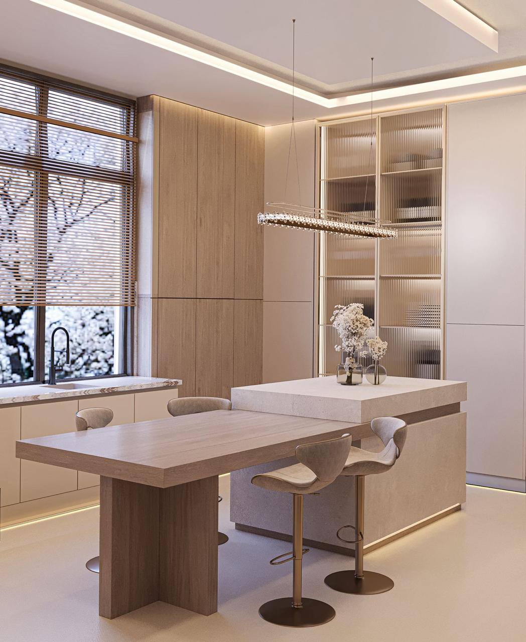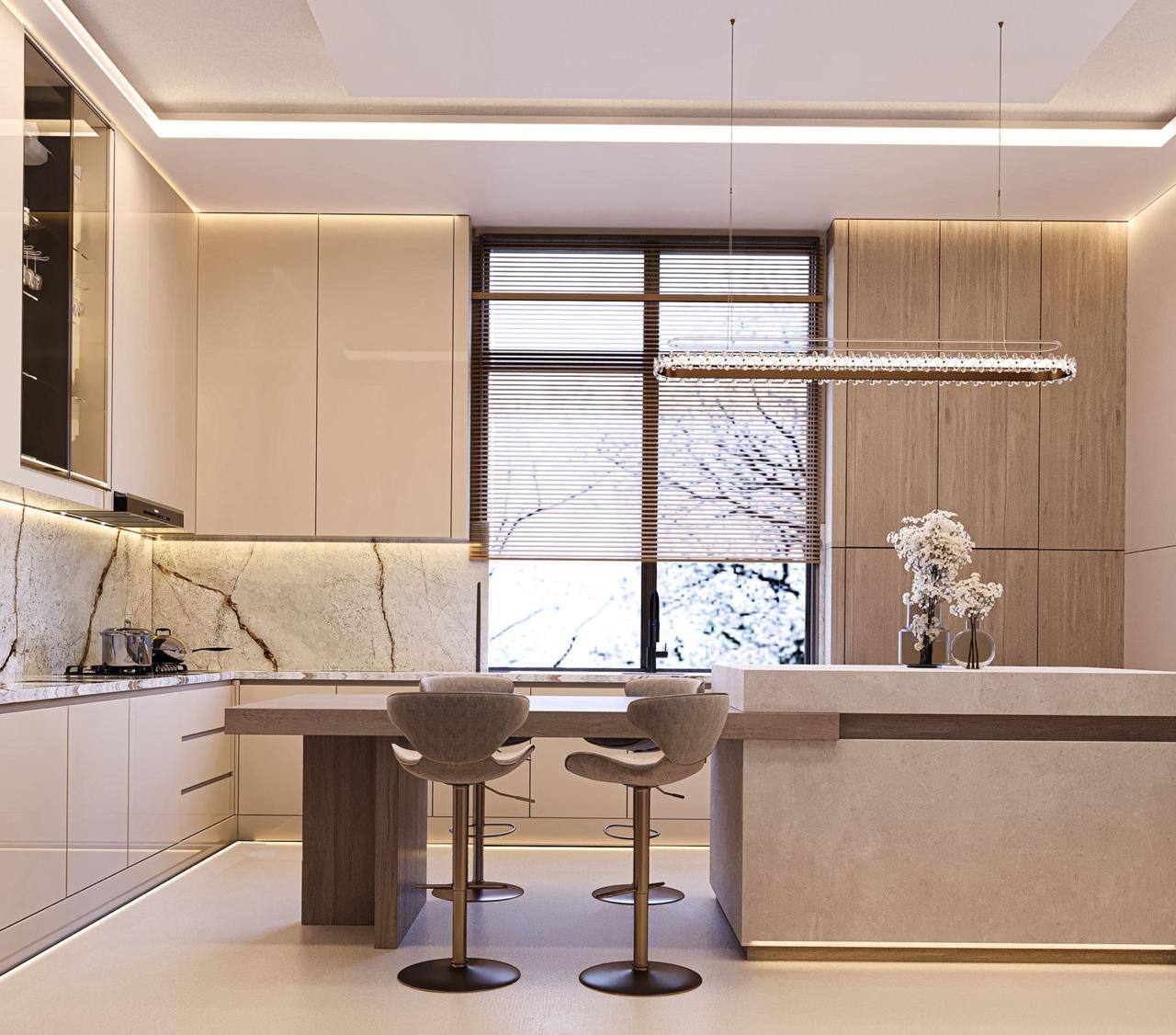 Gourmet & Professional Kitchens: The residence features a beautiful main kitchen with a marble-clad island and fluted glass accents, complemented by a secondary, professional-grade stainless steel kitchen for ultimate functionality.