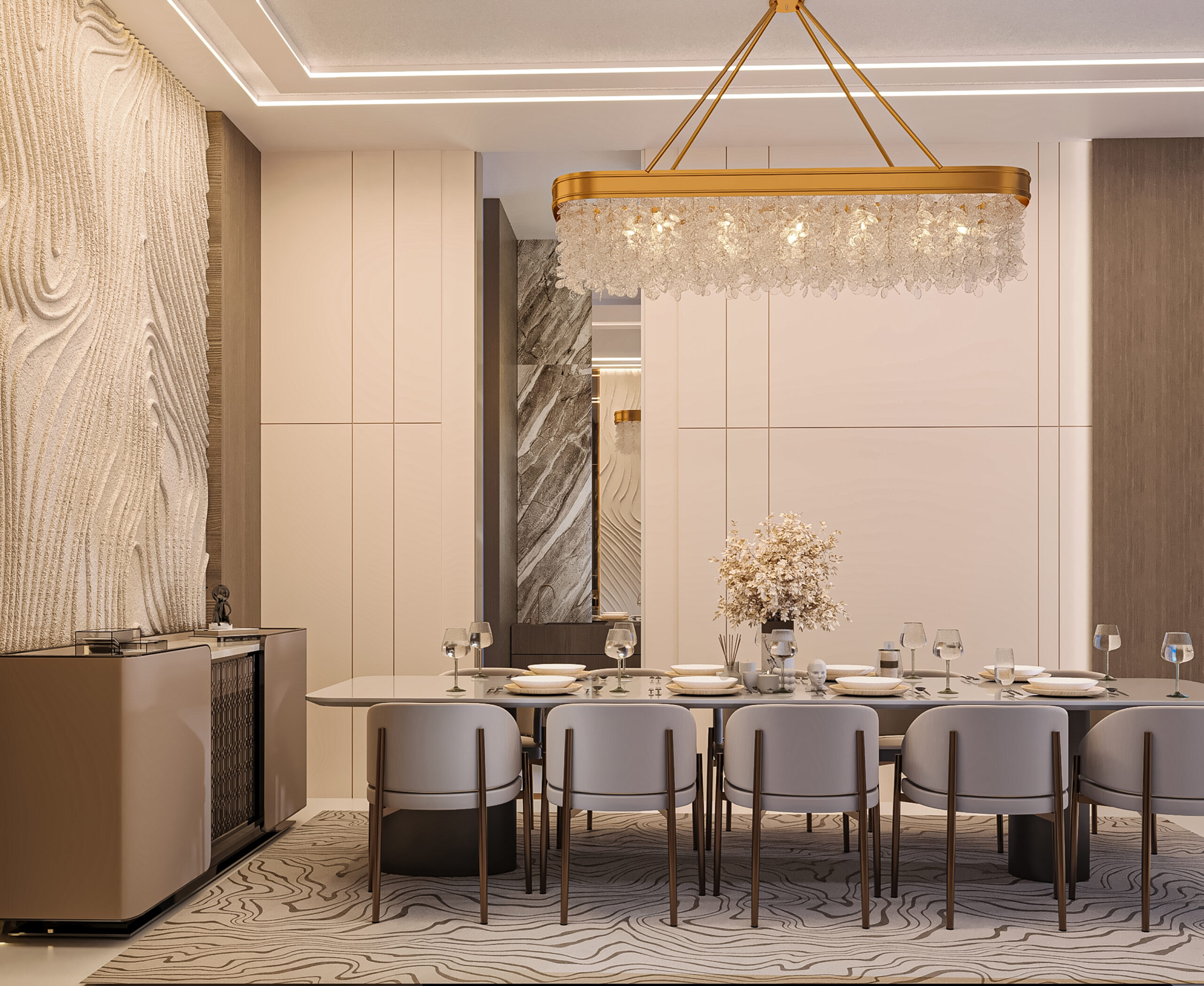 Our approach was to treat each space as a unique experience within a unified design language. We established a consistent palette of rich woods, elegant stone, and warm metallic accents to create a seamless transition between rooms. For the formal men’s majlis, we focused on grandeur, using bespoke fabric art and intricate plasterwork. In contrast, the women’s majlis was designed to be bright and airy, with large windows and a connection to a dining area.