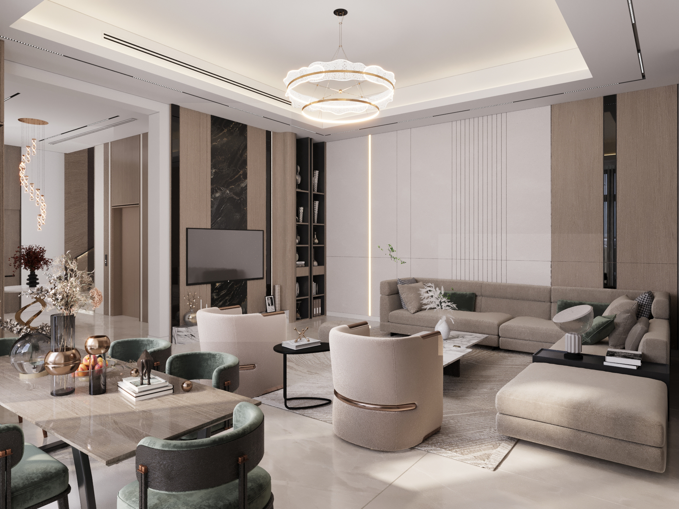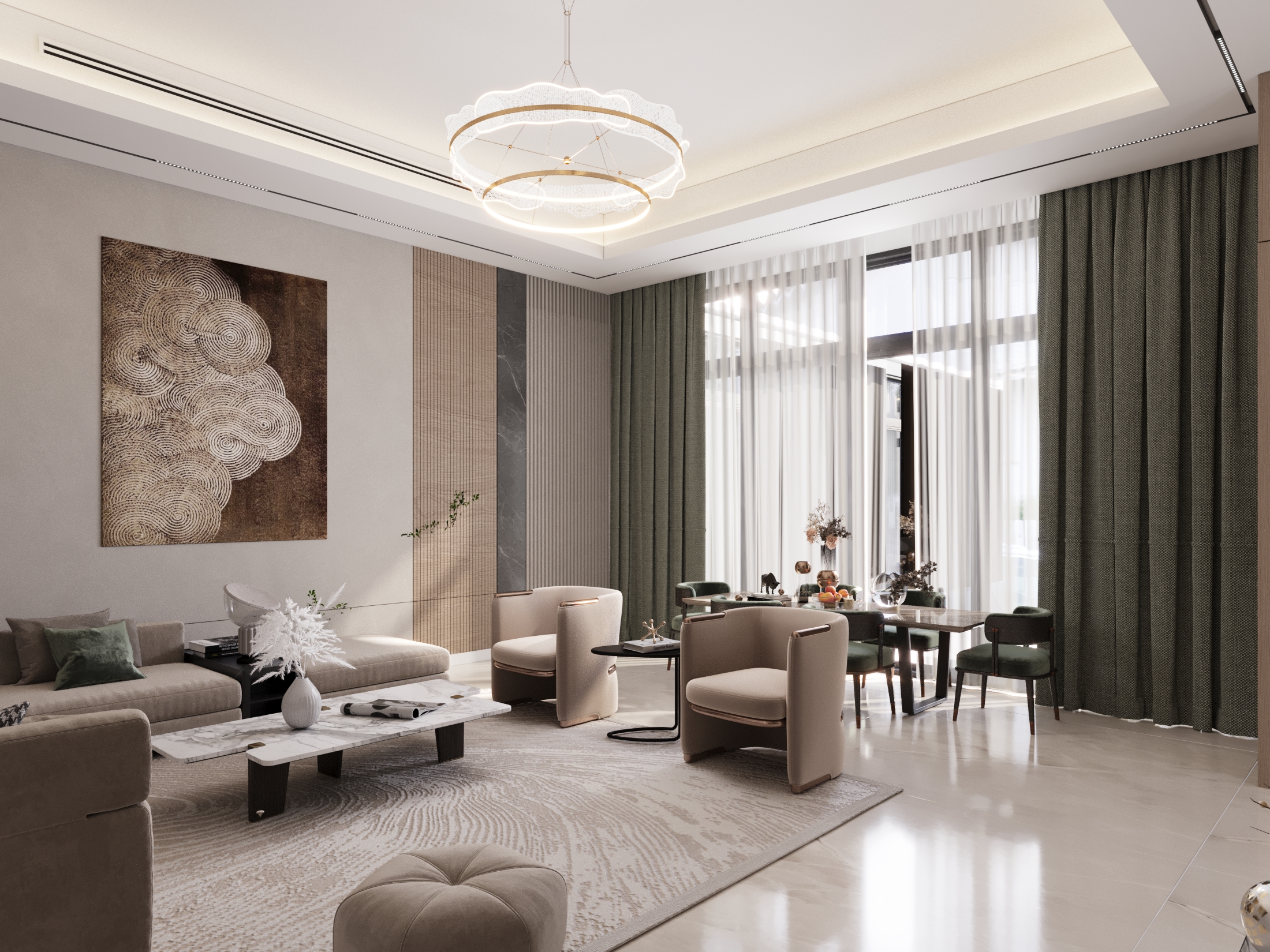 Dual Majlis Design: Two distinct majlis areas cater to different needs—one formal and grand with custom wall treatments, and another that is bright, modern, and perfect for family gatherings.