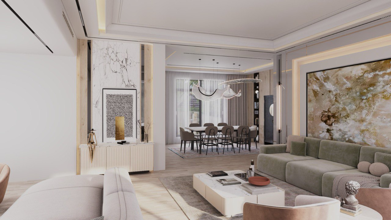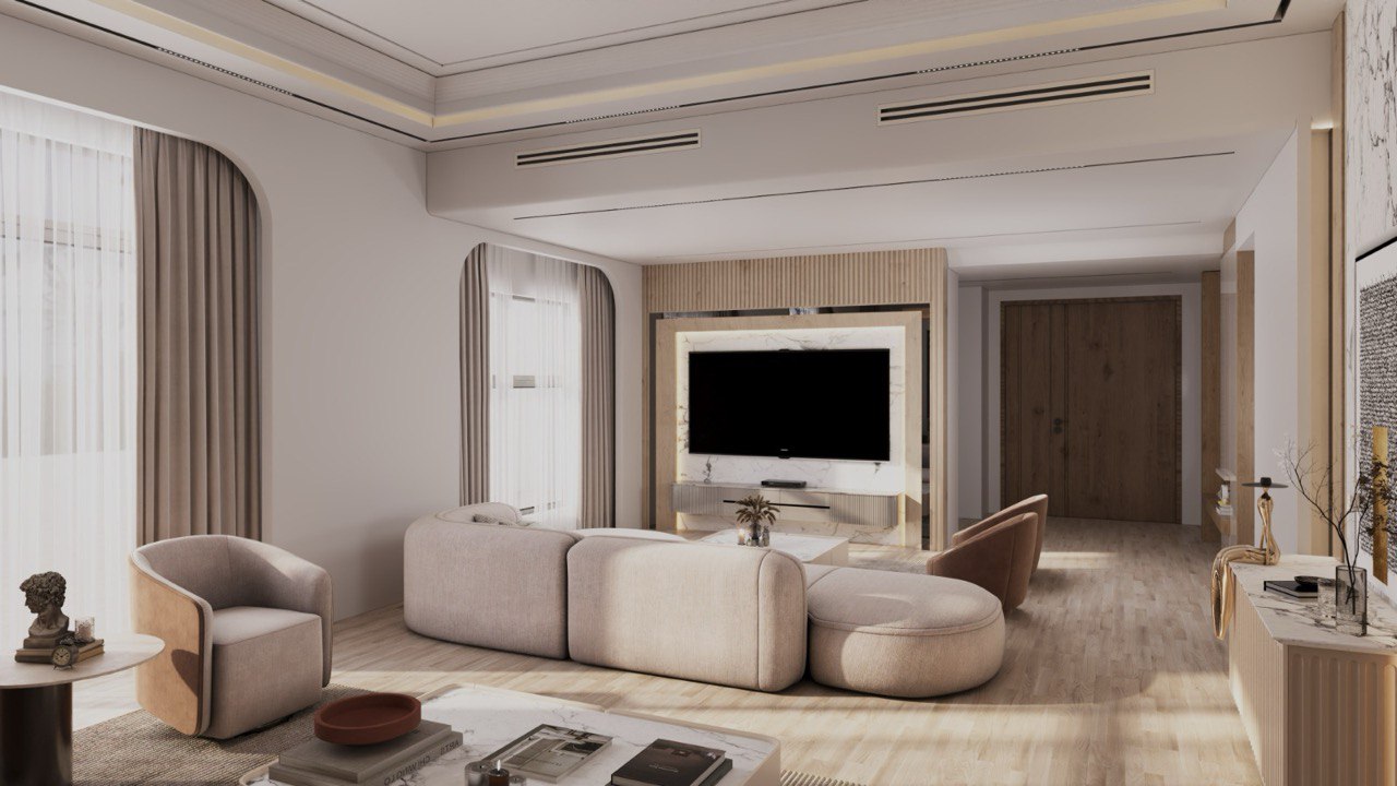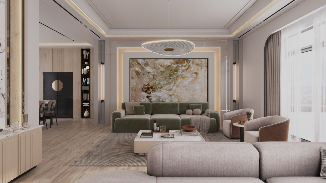 The primary challenge in this modern apartment interior design in Dubai was the height difference between the living room windows, which threatened to disrupt the visual harmony of the space. The lower ceiling level on one side created a significant design obstacle. Our goal was to seamlessly integrate a solution that would not only hide this variation but also enhance the room’s aesthetic. Additionally, we were tasked with incorporating the client’s existing furniture and preferred color palette—including shades of green, emerald, brown, and beige—into a cohesive and stylish new design, creating a space that felt both bespoke and welcoming.