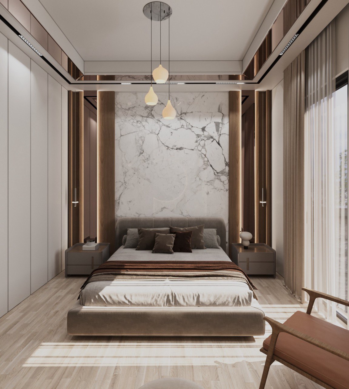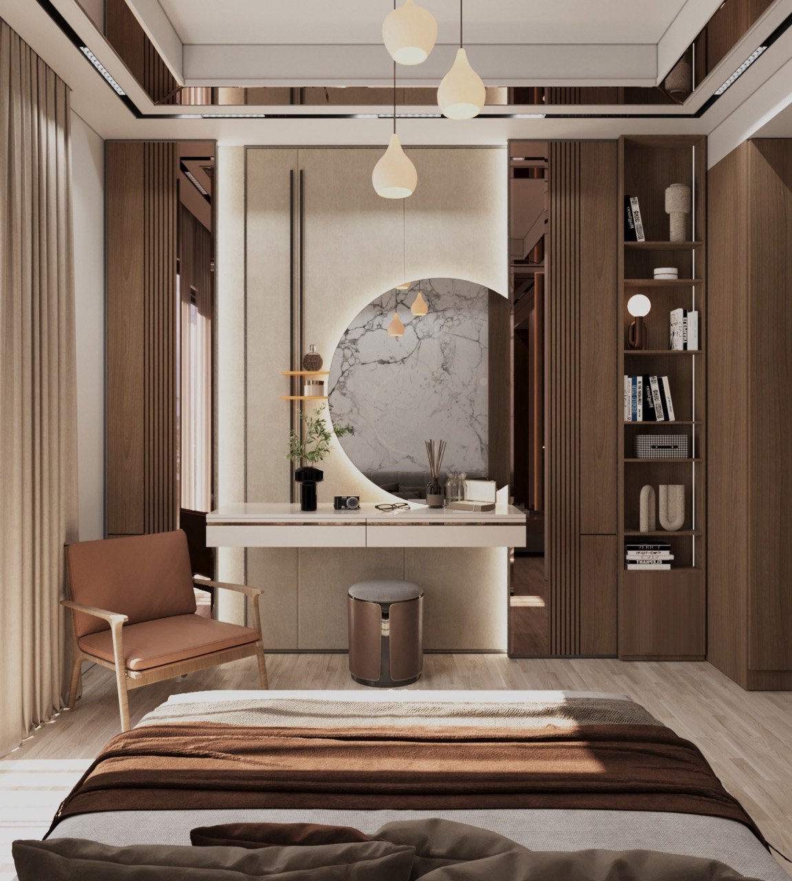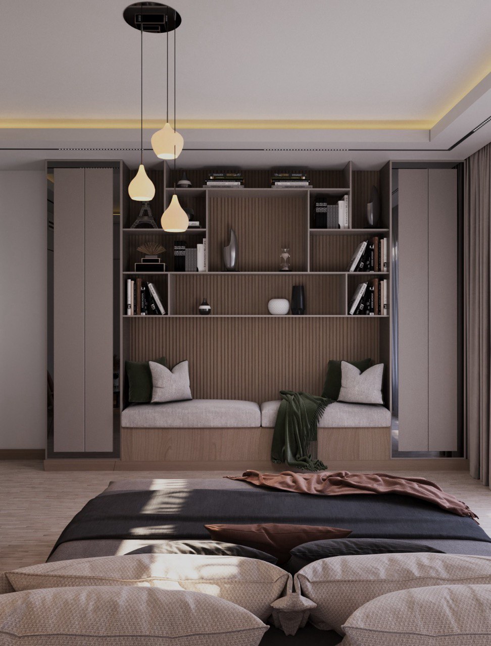 The primary challenge in this modern apartment interior design in Dubai was the height difference between the living room windows, which threatened to disrupt the visual harmony of the space. The lower ceiling level on one side created a significant design obstacle. Our goal was to seamlessly integrate a solution that would not only hide this variation but also enhance the room’s aesthetic. Additionally, we were tasked with incorporating the client’s existing furniture and preferred color palette—including shades of green, emerald, brown, and beige—into a cohesive and stylish new design, creating a space that felt both bespoke and welcoming.