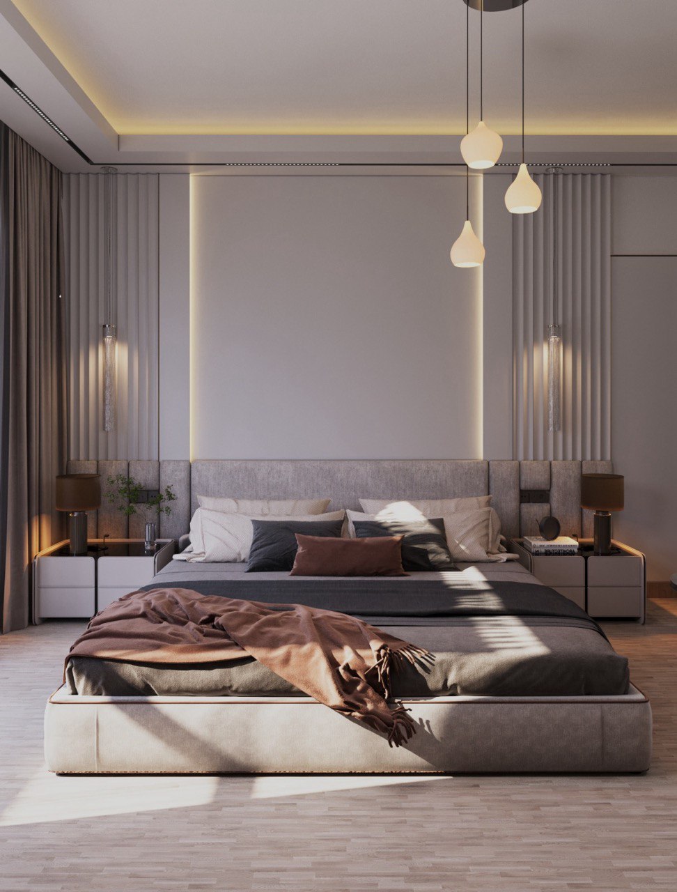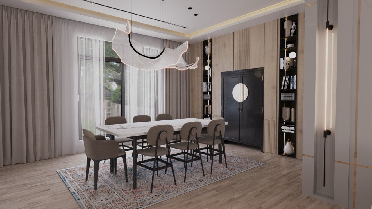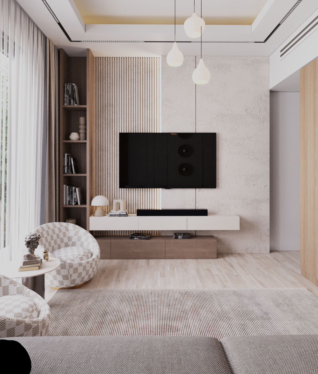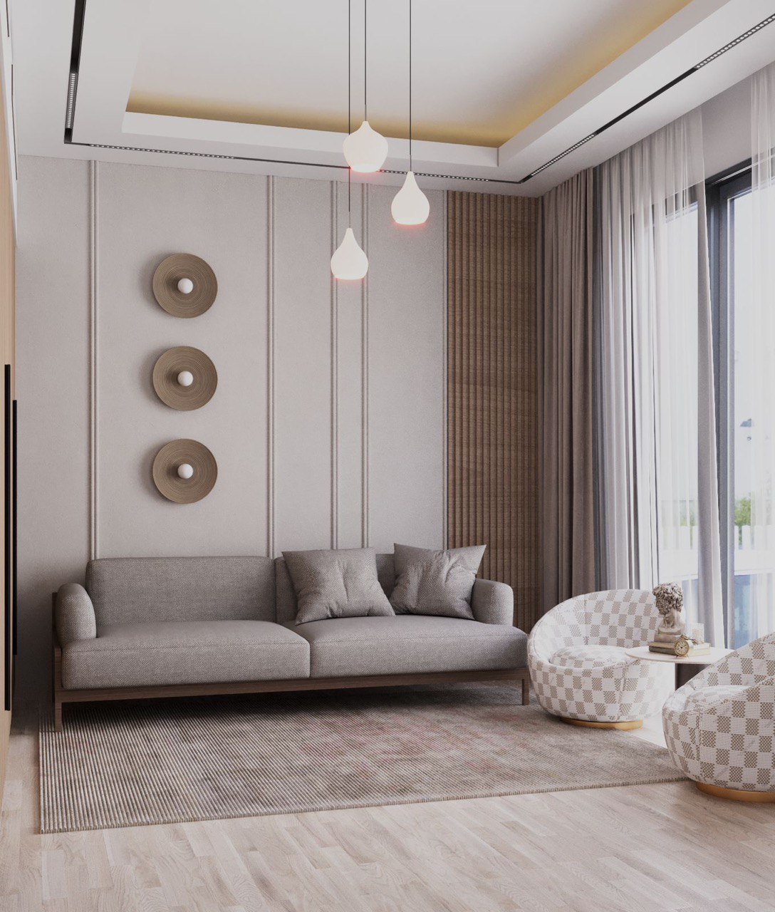 We adopted a modern and somewhat minimal design style, focusing on creating a serene atmosphere through carefully curated elements. To solve the window height issue, we designed and installed a false wall with an elegant arched shape. This architectural element not only concealed the height difference but also became a striking feature in the living area, creating a seamless and sophisticated look. Our approach involved a personalized process where we worked directly with the client’s existing furniture, integrating each piece—from the bar cabinet to the lighting fixtures—into the overall concept. For the bar cabinet, we complemented it with custom shelving and wall-mounted cabinets, balancing its proportions and giving it a new, functional identity.