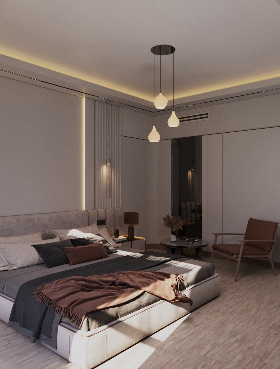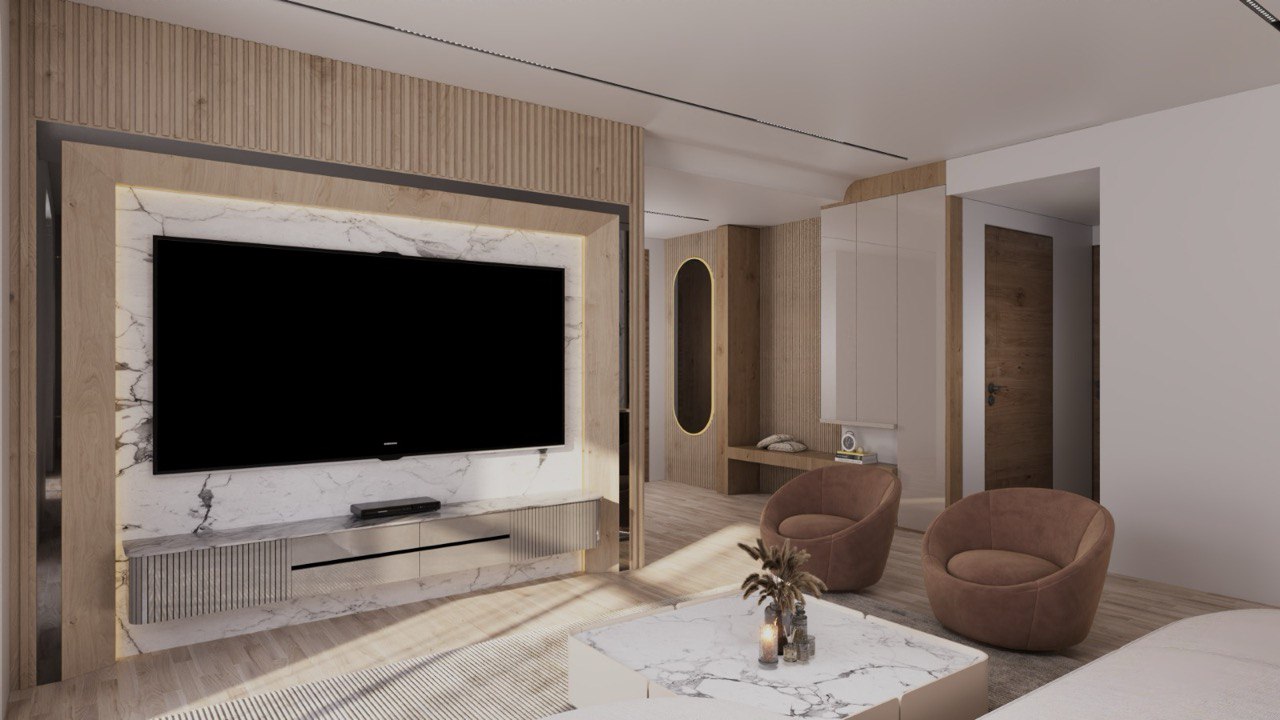 This 250-square-meter apartment in Madinat Jumeirah showcases a refined blend of personalization and modern design. The ambient lighting was a key element of our approach, creating a cozy and intimate feel throughout the home. A stunning wing-shaped accent wall, inspired by the client’s furniture and finishes, was created opposite the entrance to serve as a dramatic focal point. For the balcony, we selected wooden flooring and comfortable furniture made from African Iroko wood, complemented by ambient string lights to craft an intimate and warm outdoor retreat. Although some of the client’s pre-purchased items, such as the chandeliers, presented a design constraint, we enhanced the space by adding modern, linear ceiling lighting, which provided a contemporary and clean finish. The final result is a personalized luxury apartment in Dubai that perfectly combines aesthetics with smart, problem-solving design.